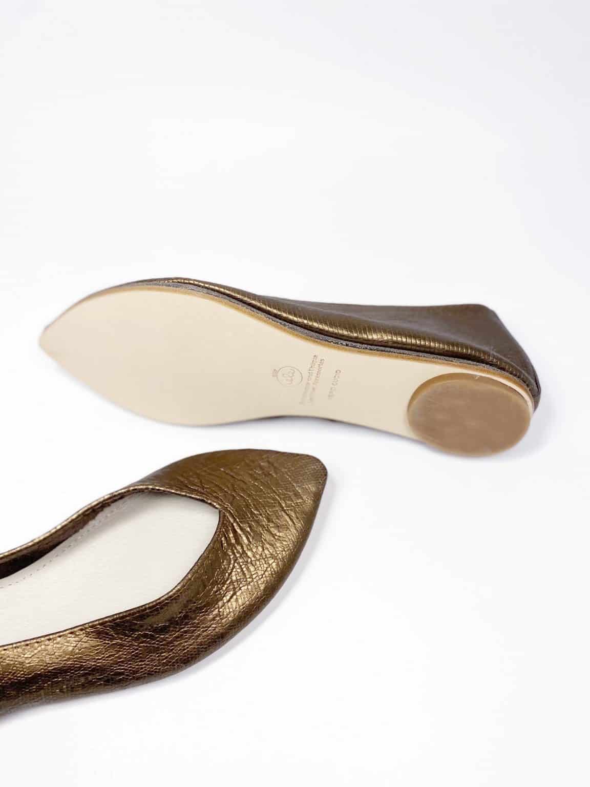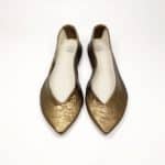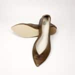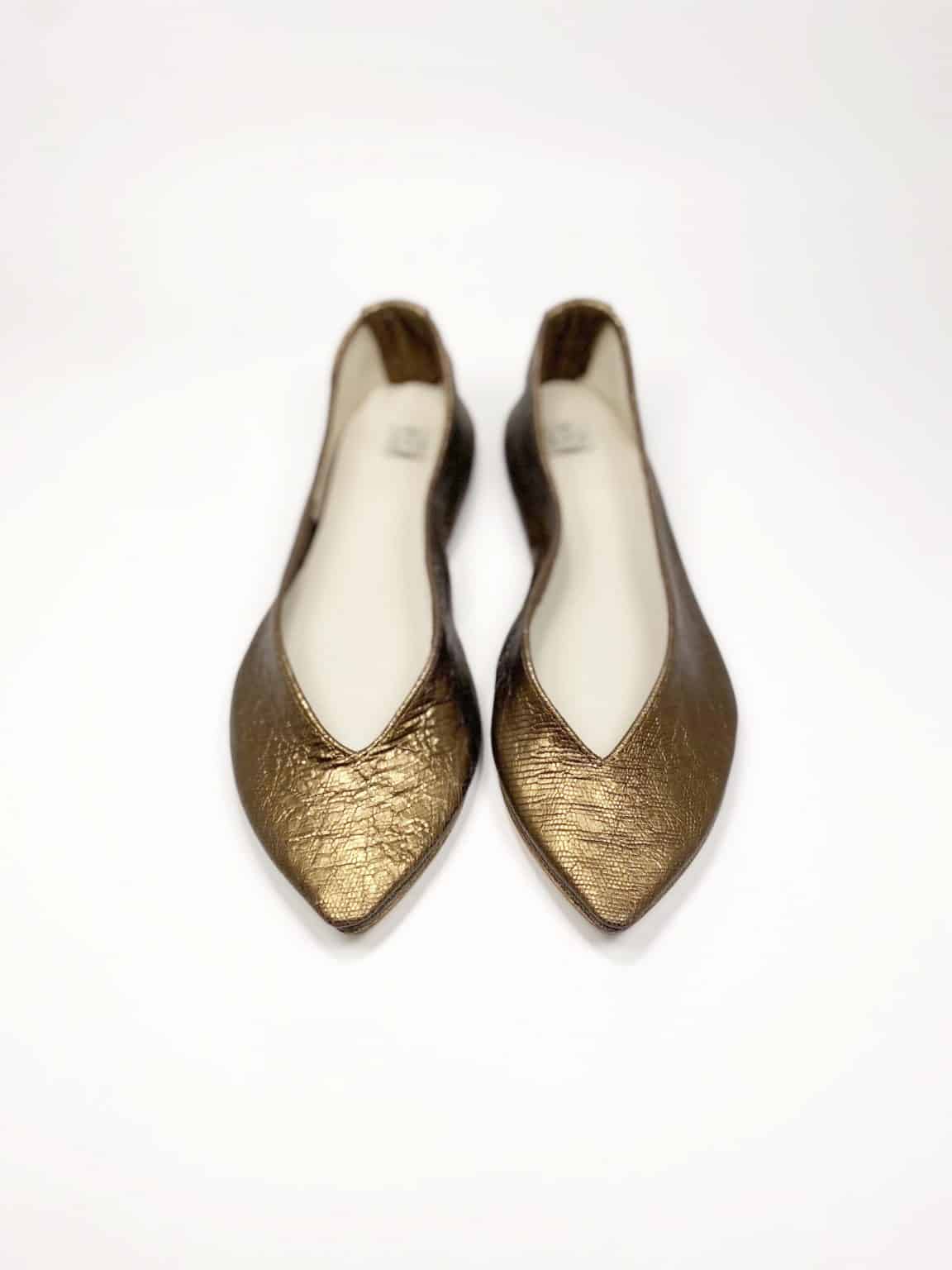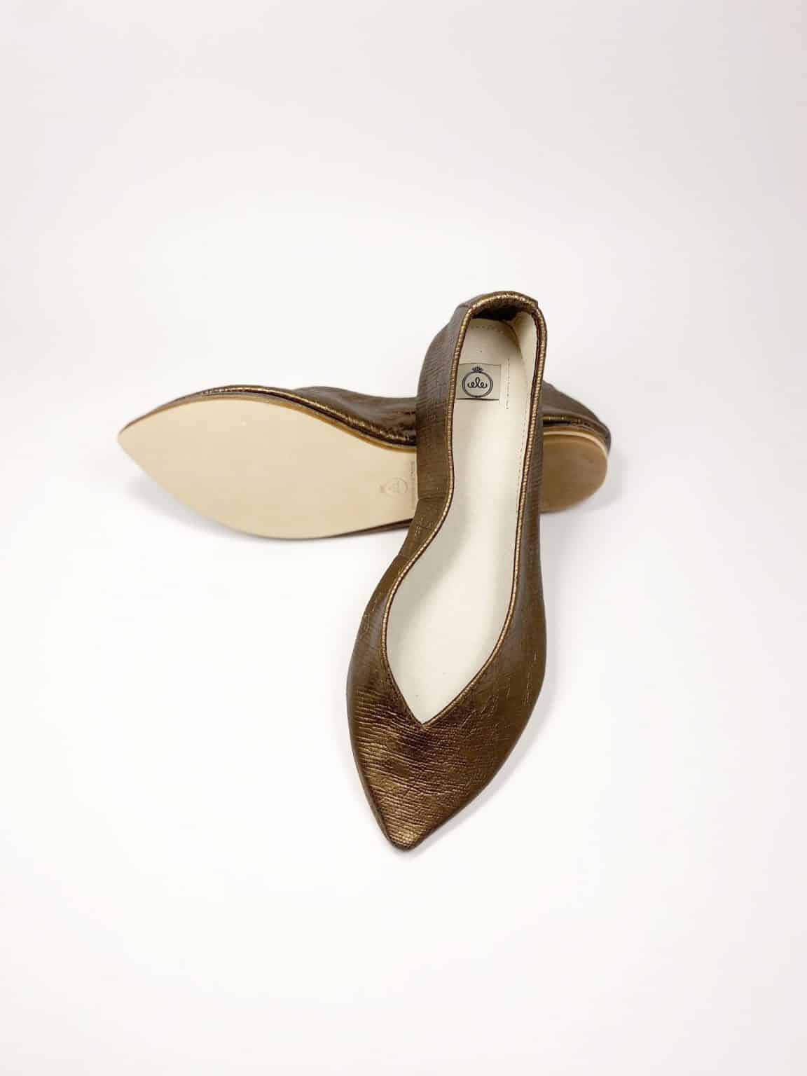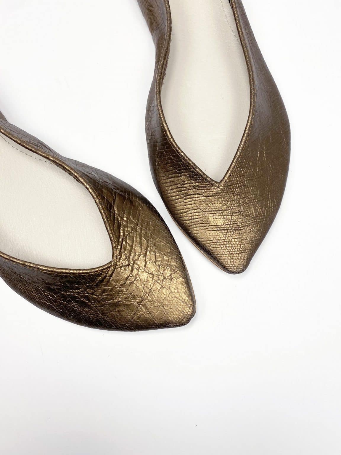 Chic and unique pointed toe bronze flats. Exotic Italian leather upper. Low heel and leather soles.