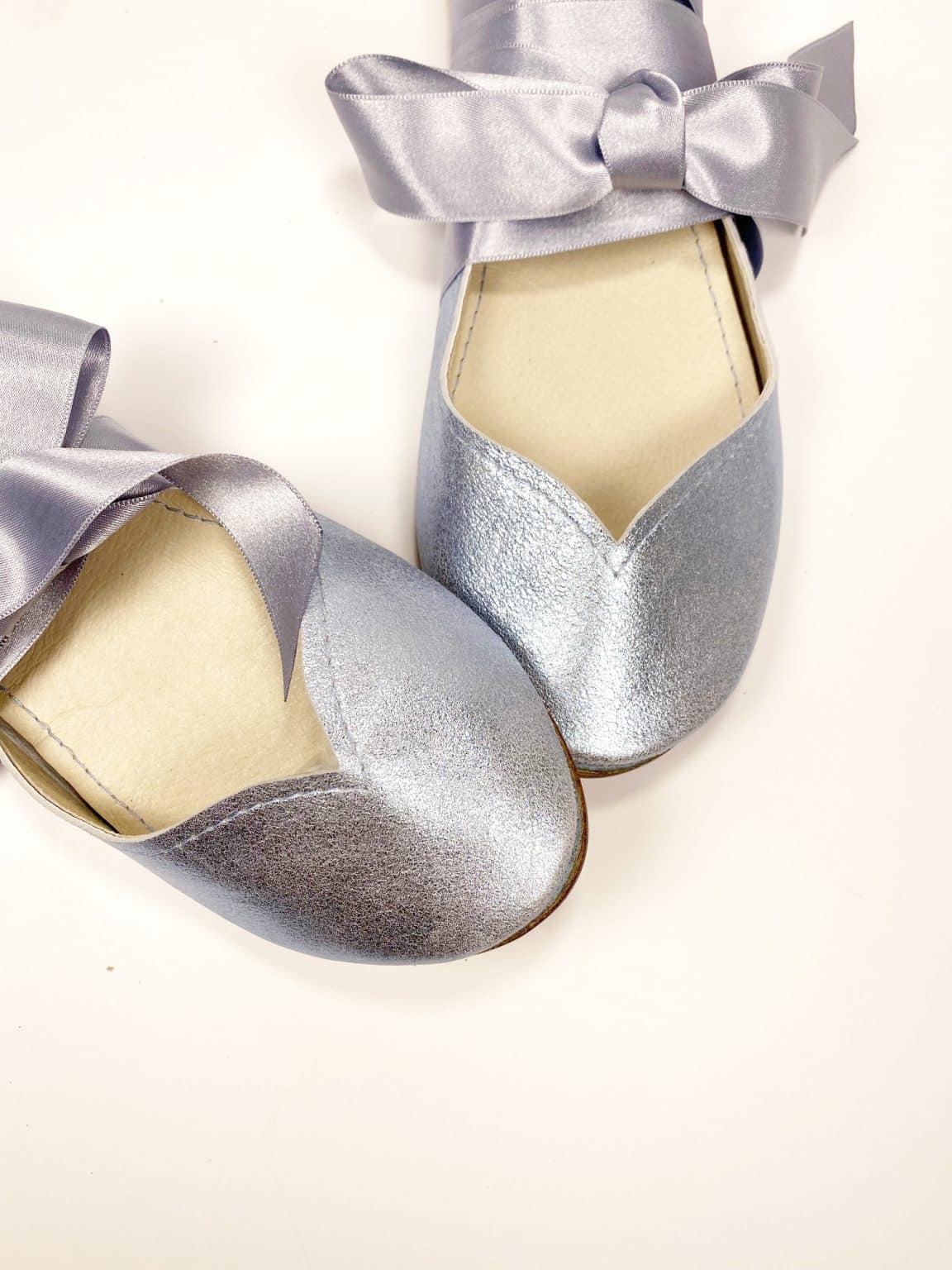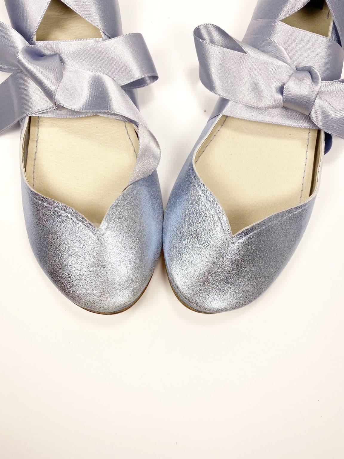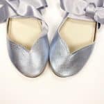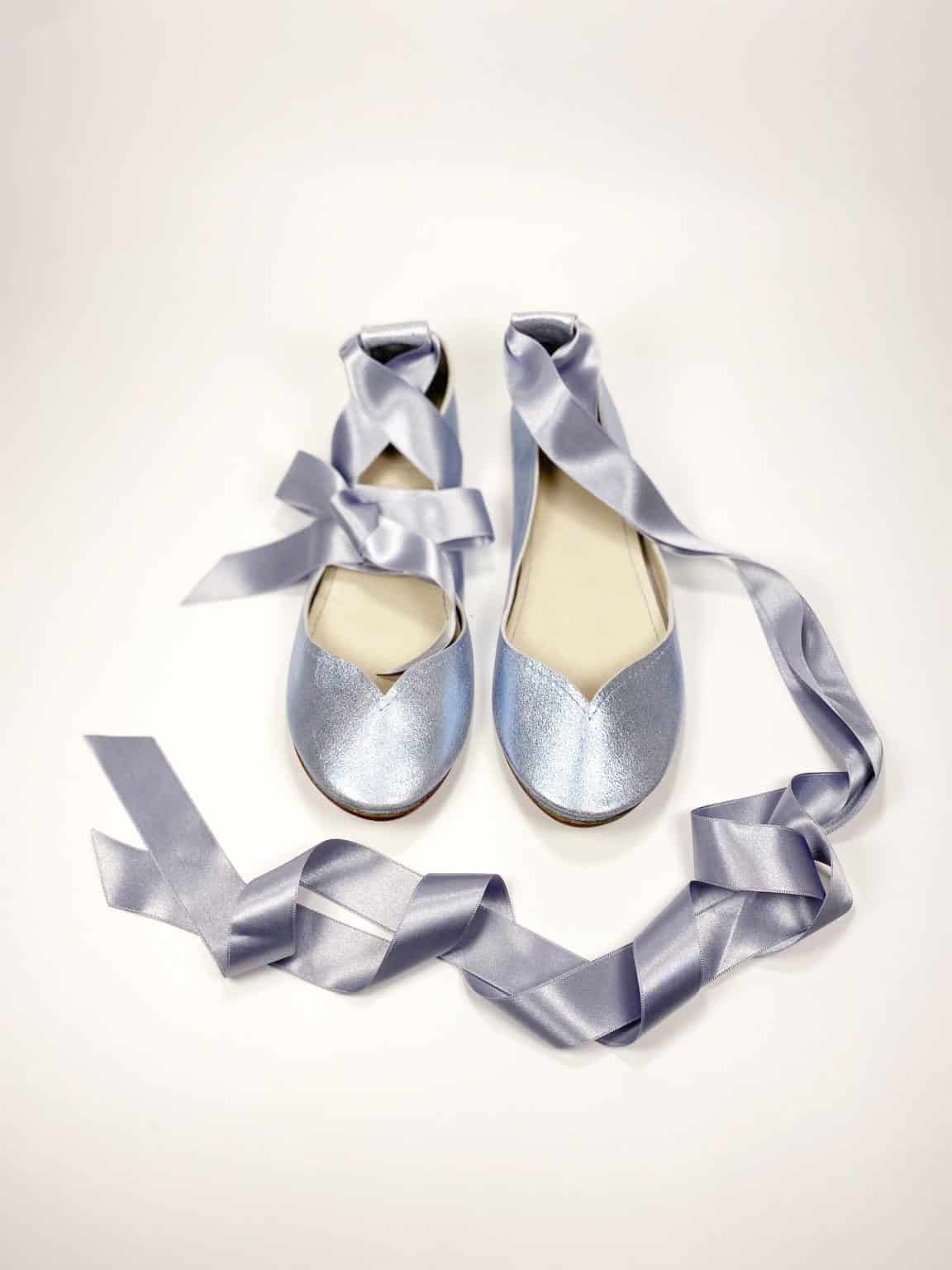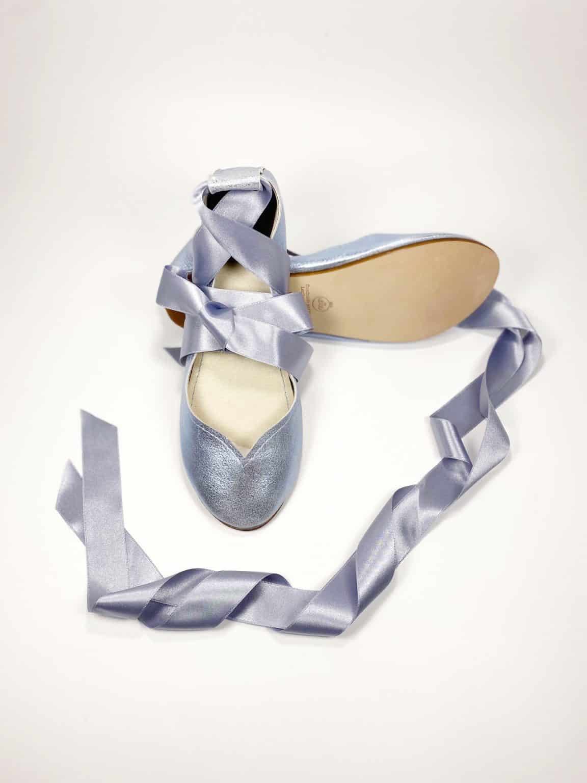 30% OFF SALE! size 38 ROUND FLATS IN LIGHT BLUE METALLIC LEATHER with SATIN RIBBONS