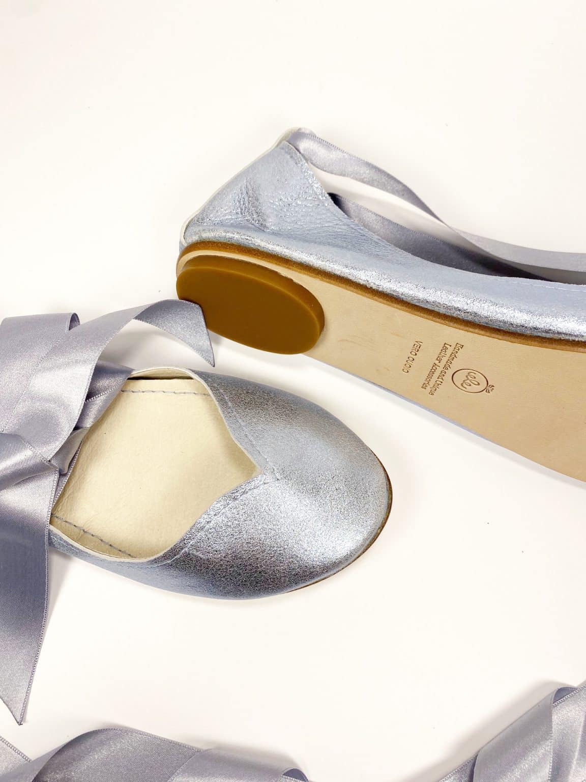Chic ballet flats with lace up satin ribbons. Upper in light blue soft Italian leather. Genuine leather soles and low heel.