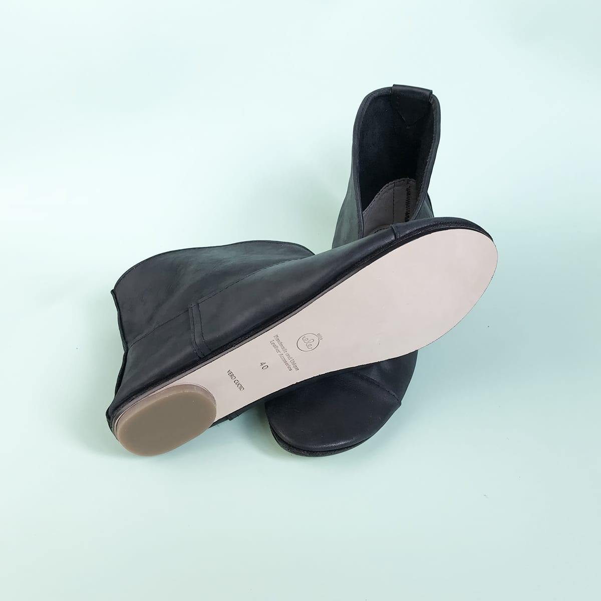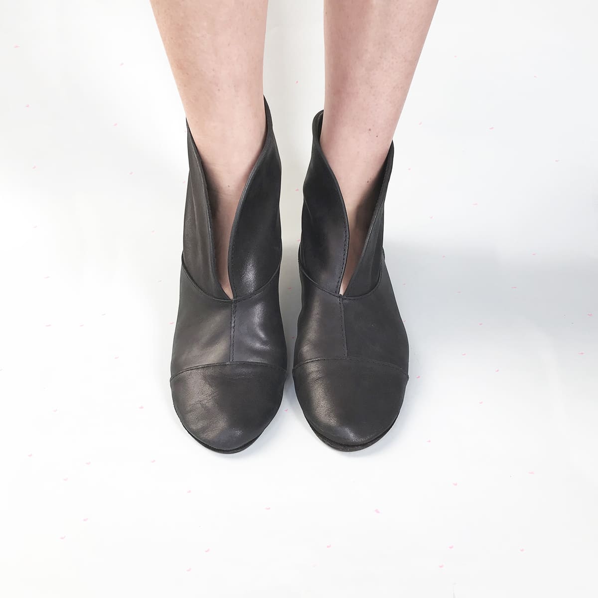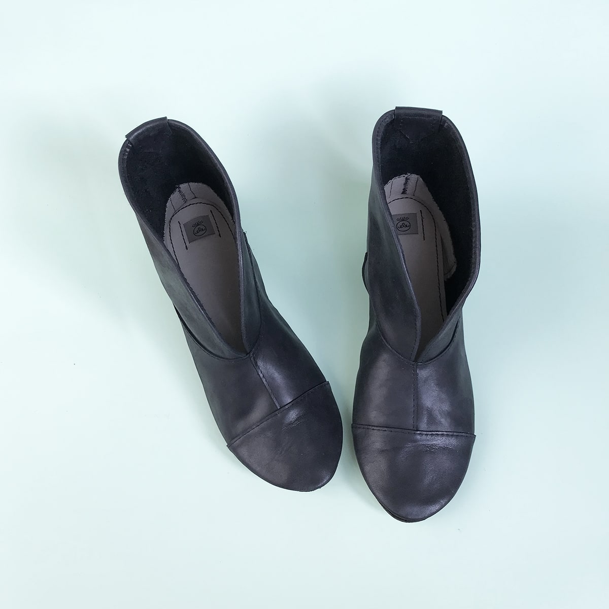 Stylish and unique ankle booties. Upper in buttery soft black Italian leather. Low heel and super comfortable fitting.