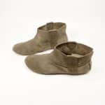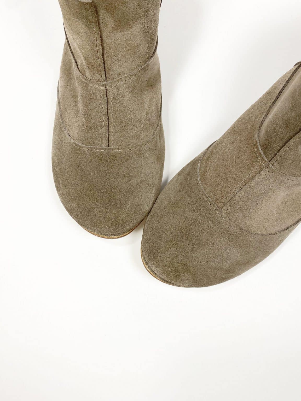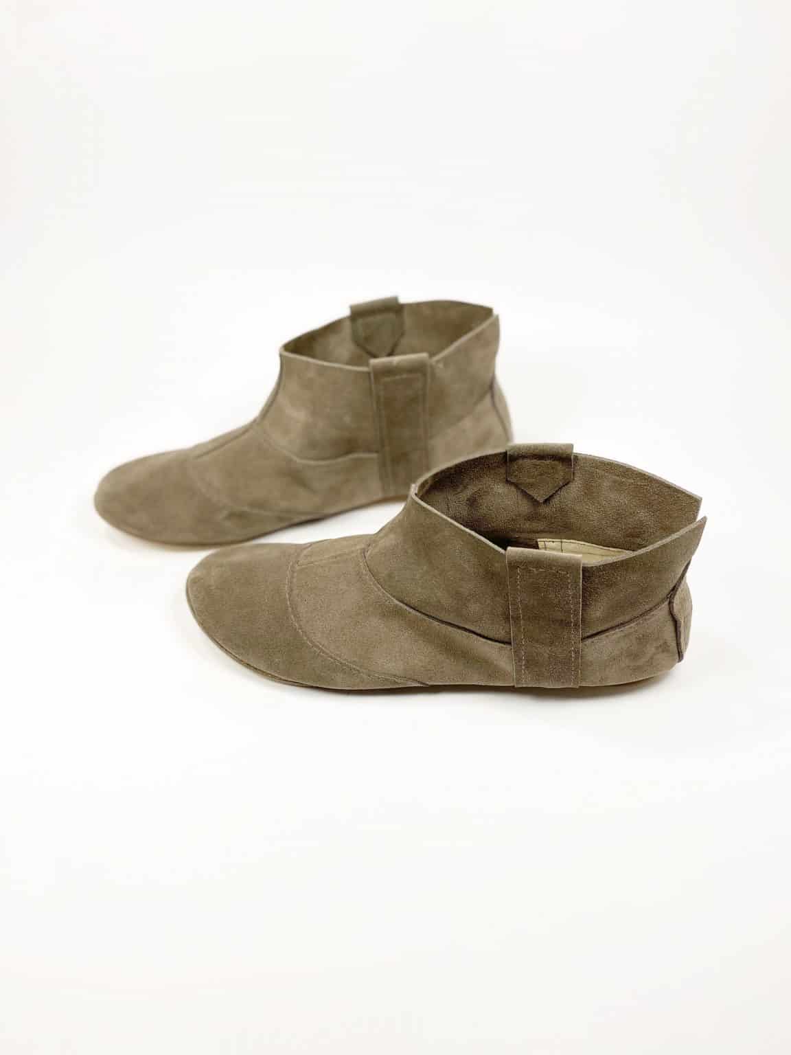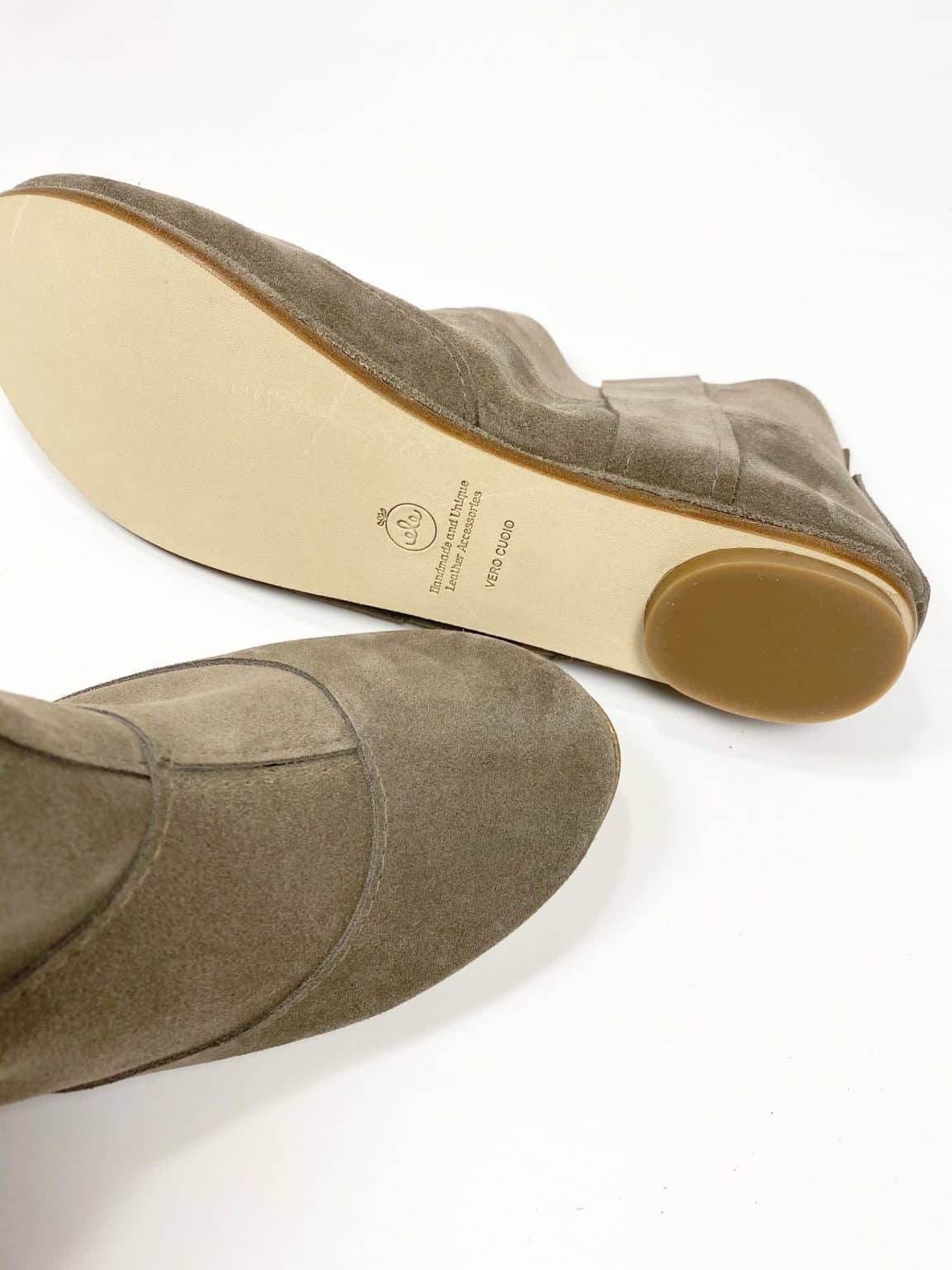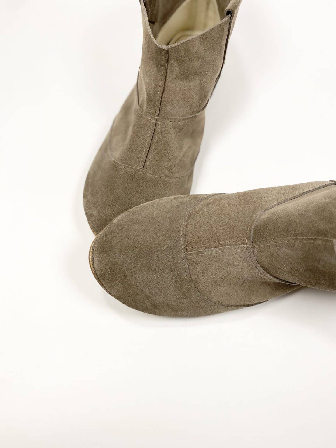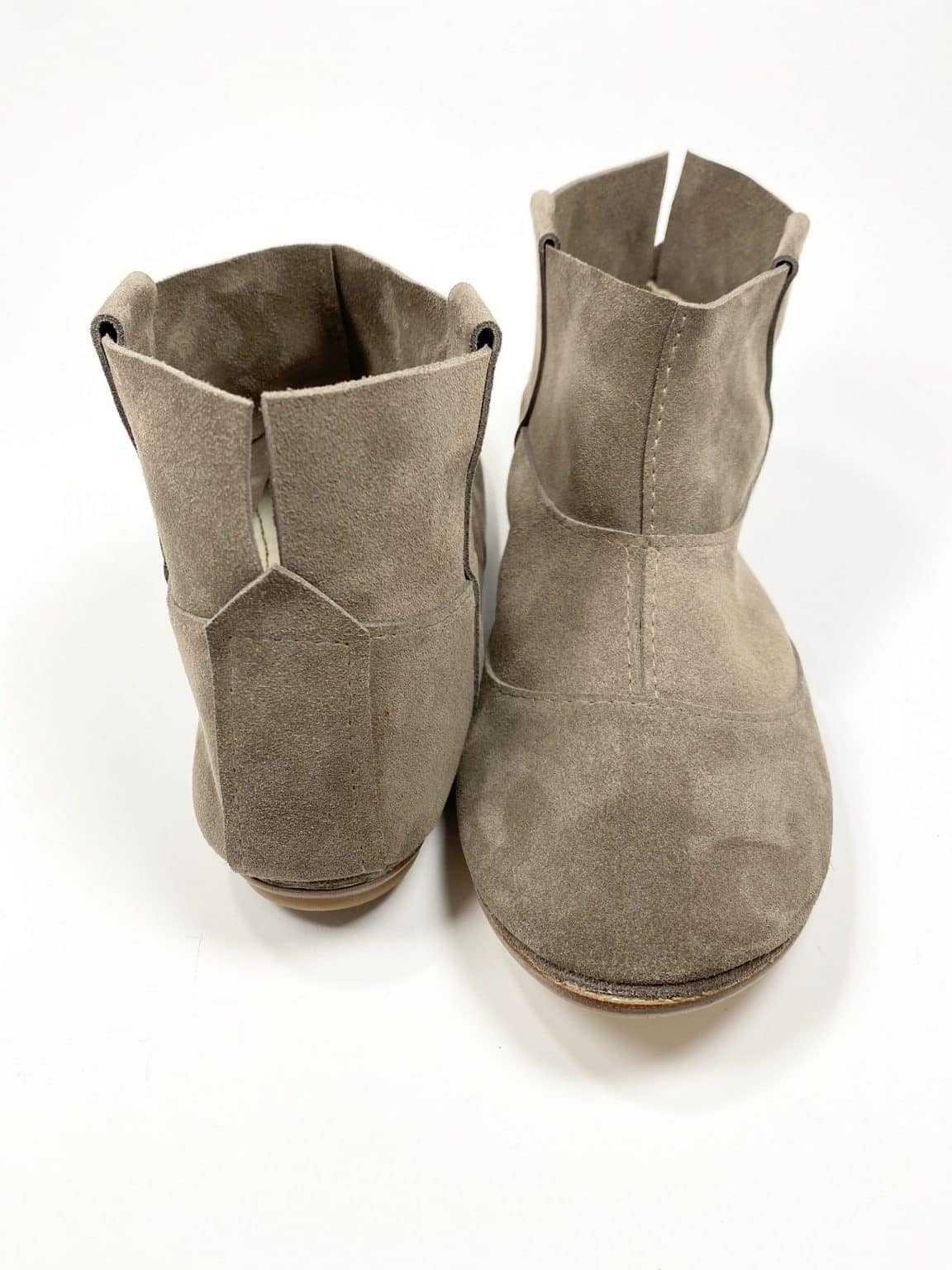 Stylish and unique ankle booties. Upper in buttery soft taupe Italian suede. Low heel and super comfortable fitting.