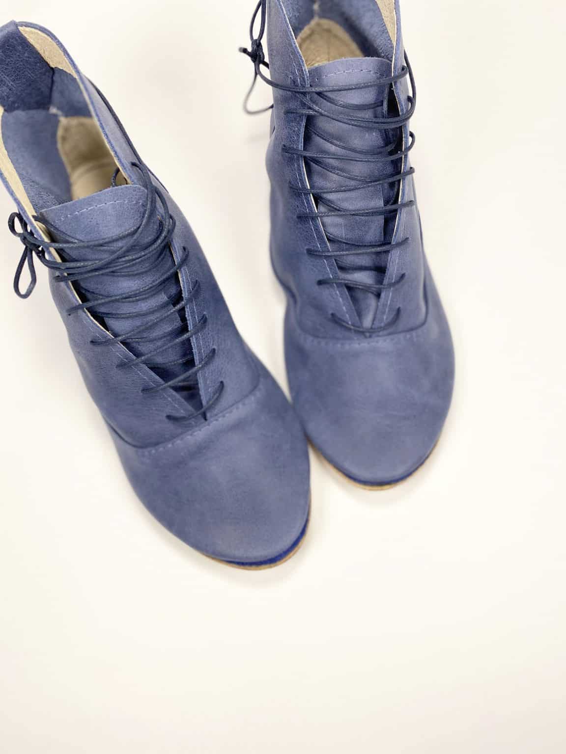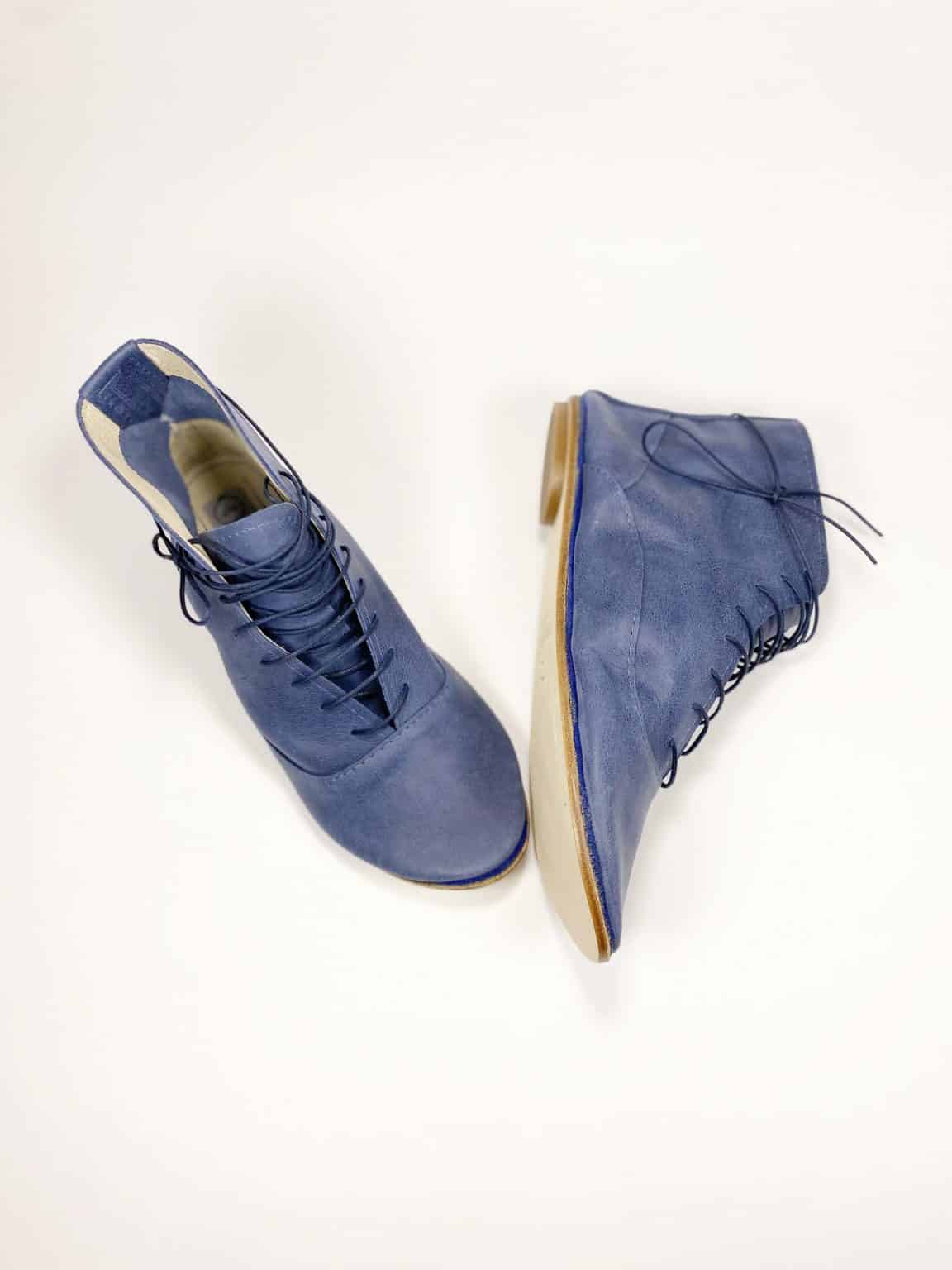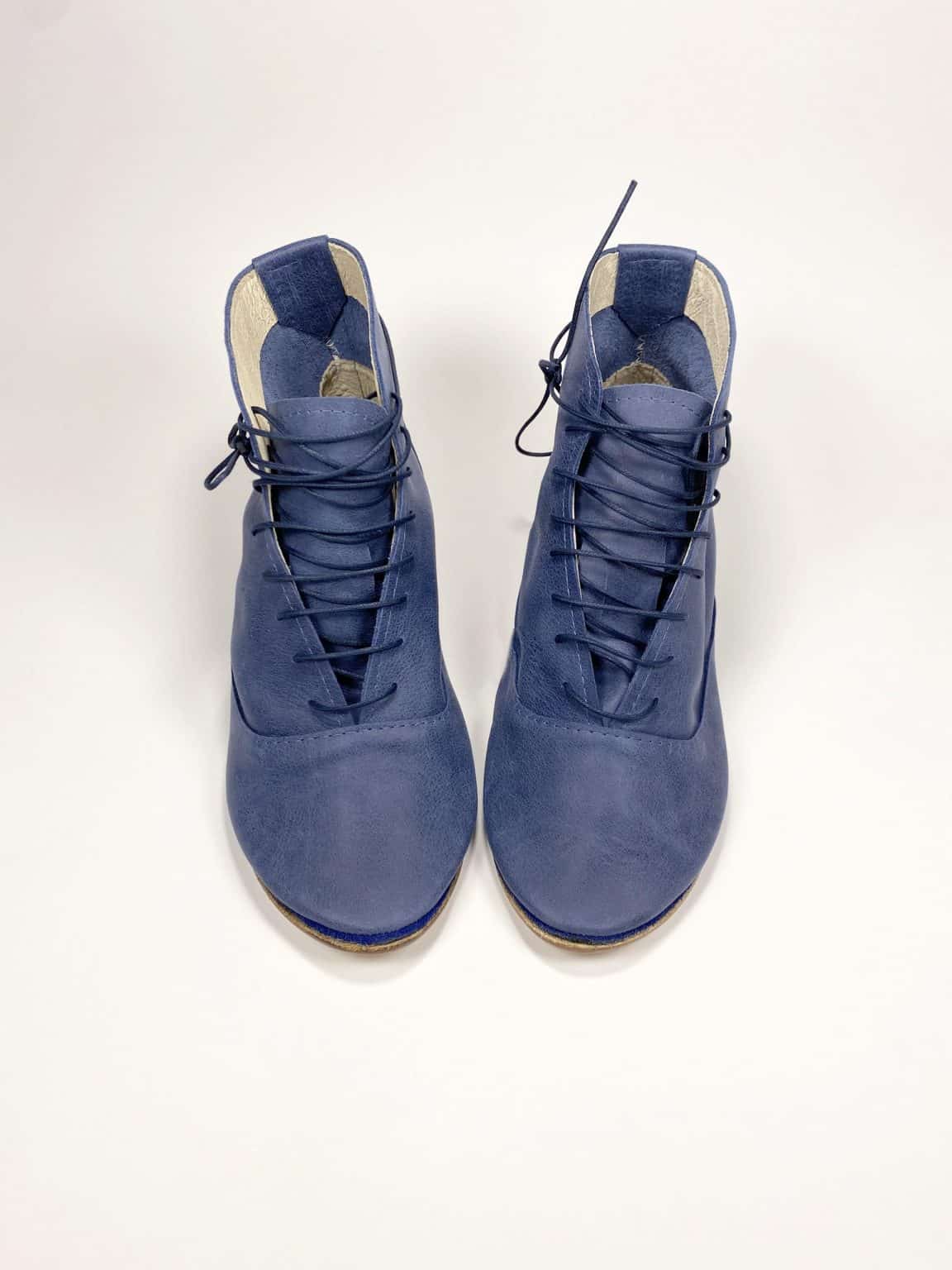 Stylish and super comfortable ankle booties. Upper in buttery soft blue Italian leather. Low heel and lace-up fastening.
