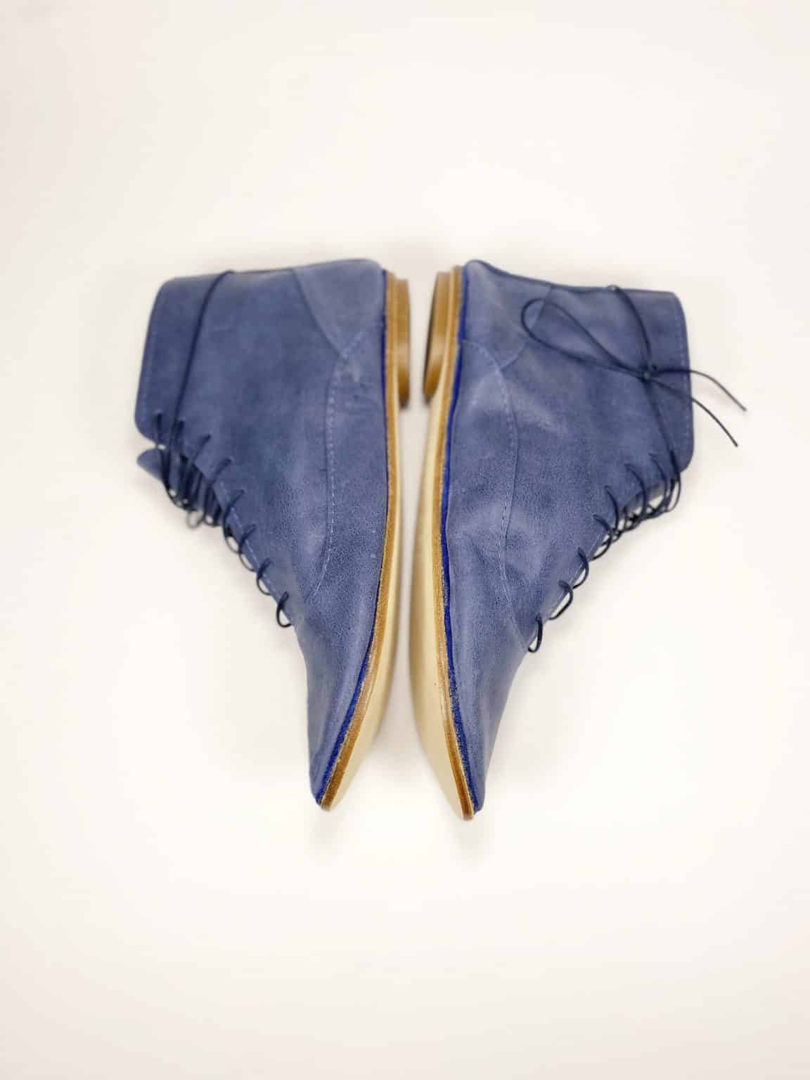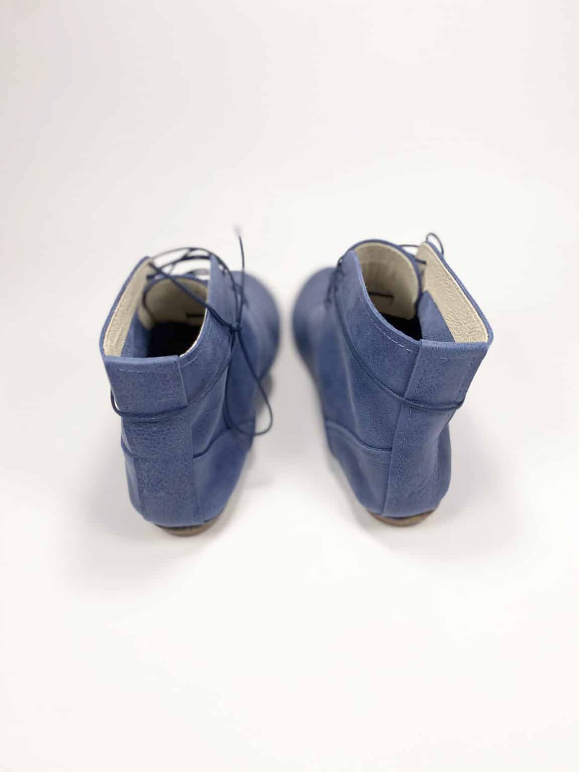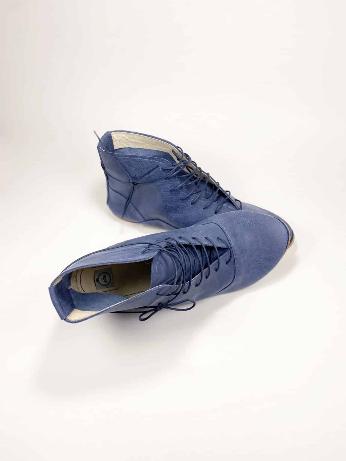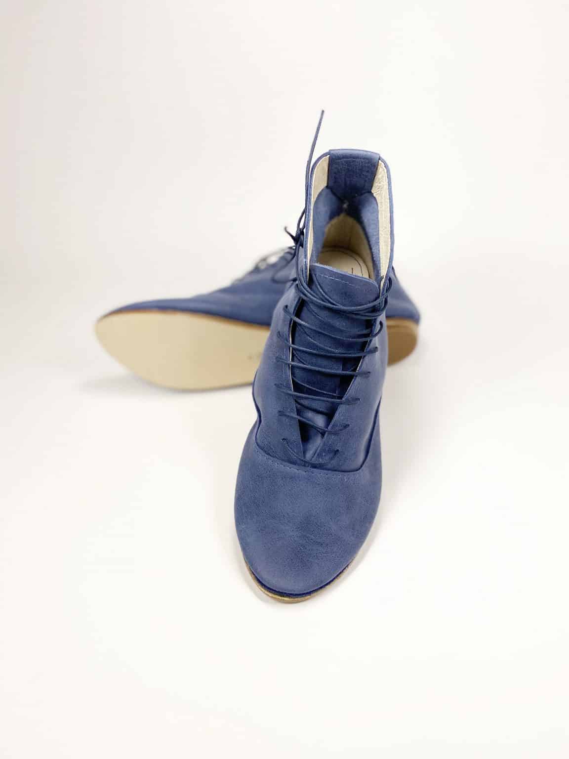Stylish and super comfortable ankle booties. Upper in buttery soft blue Italian leather. Low heel and lace-up fastening.