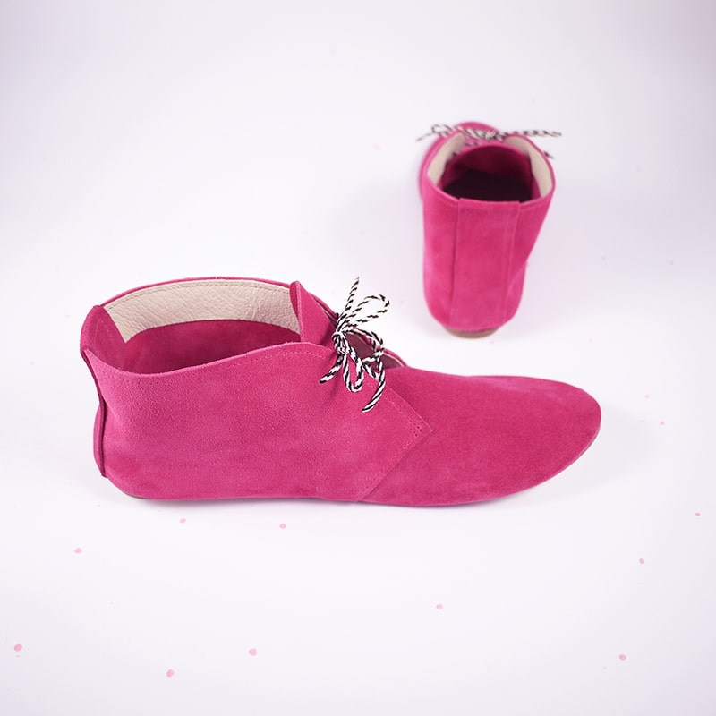 Stylish and unique ankle desert booties. Upper in buttery soft magenta Italian suede. Low heel and super comfortable fitting.