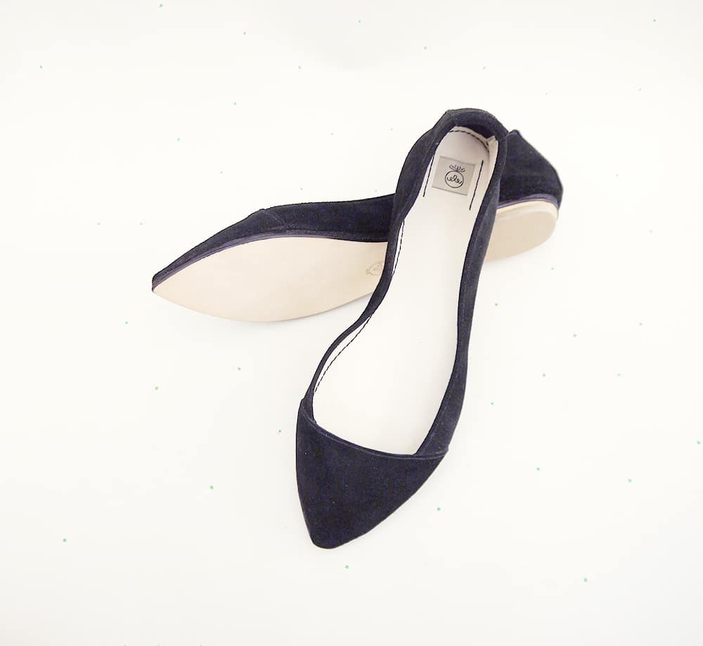 Stylish and super comfortable pointed toe D’ Orsay Flats. Upper in soft black Italian suede leather. Low heel and leather soles.