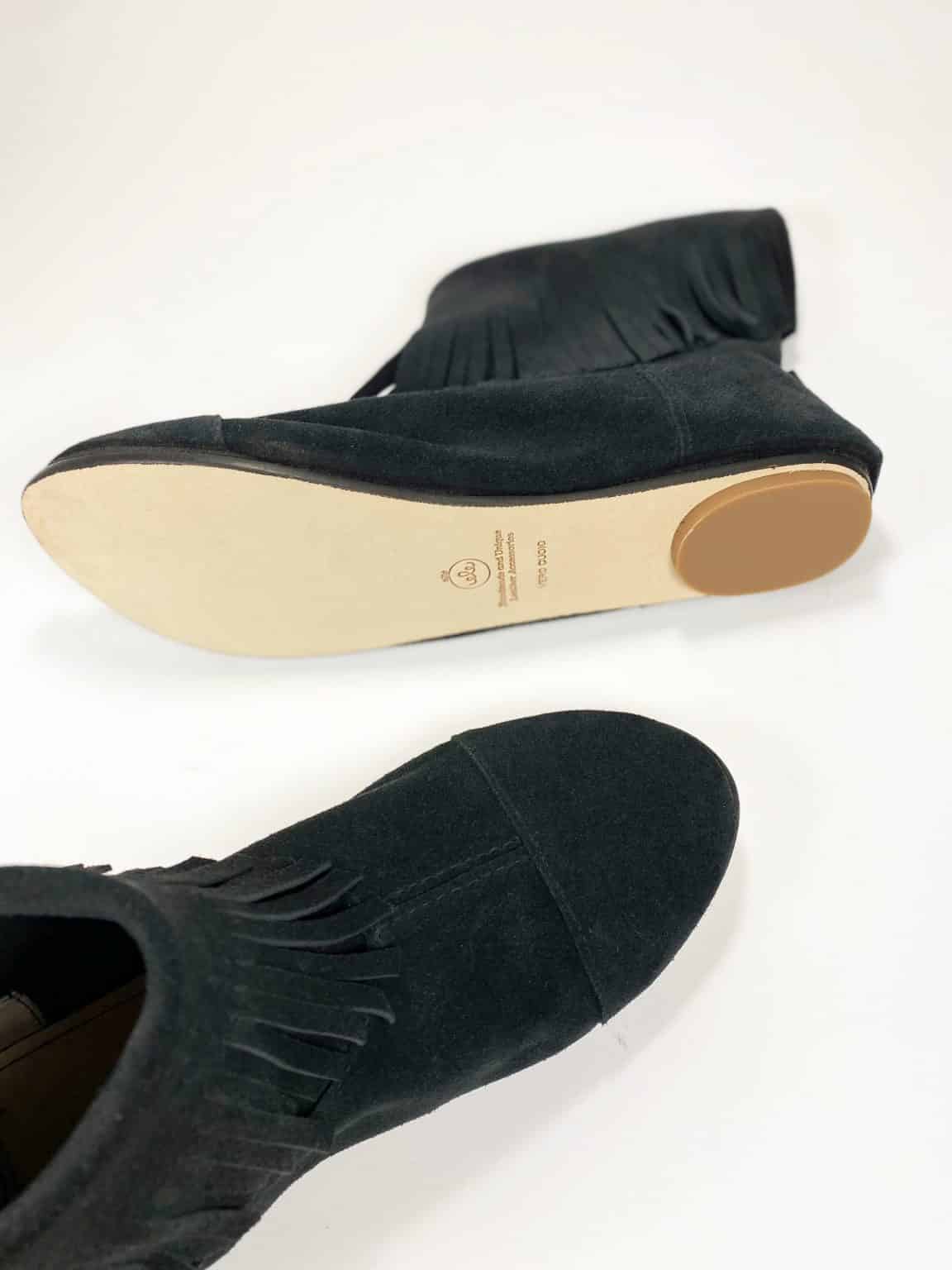 Cute and comfortable Fringed ankle booties. Upper in buttery Black Italian leather. Low heel and genuine leather soles.