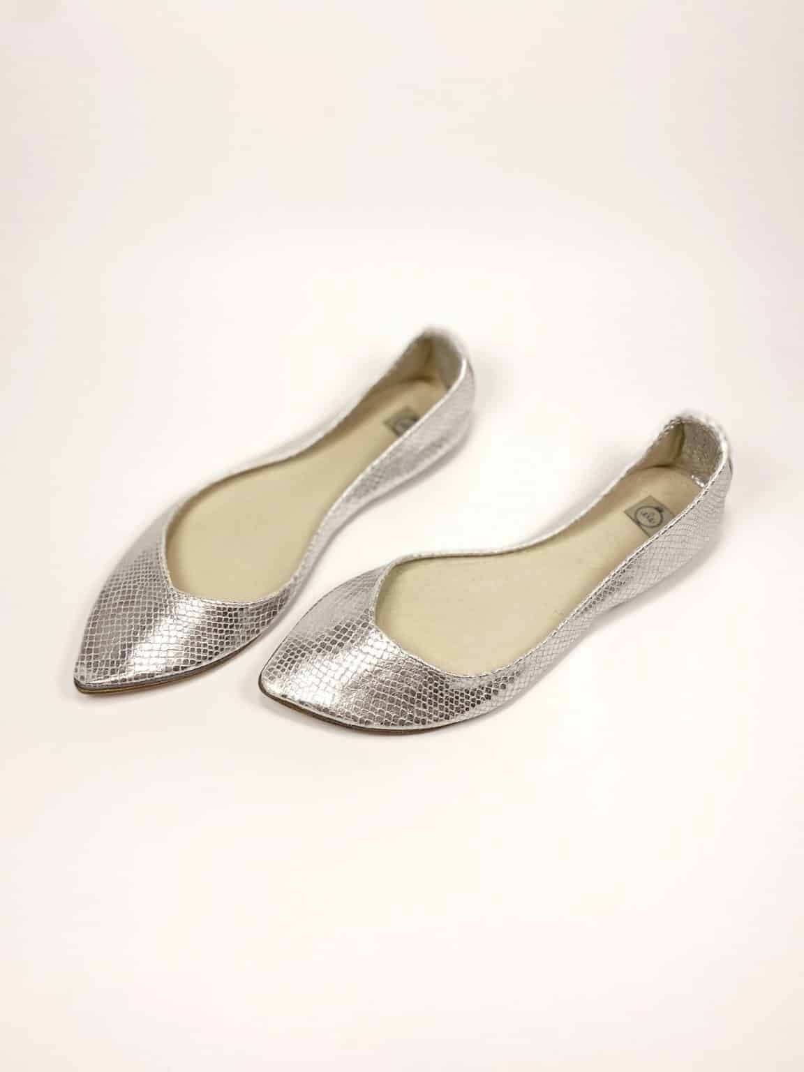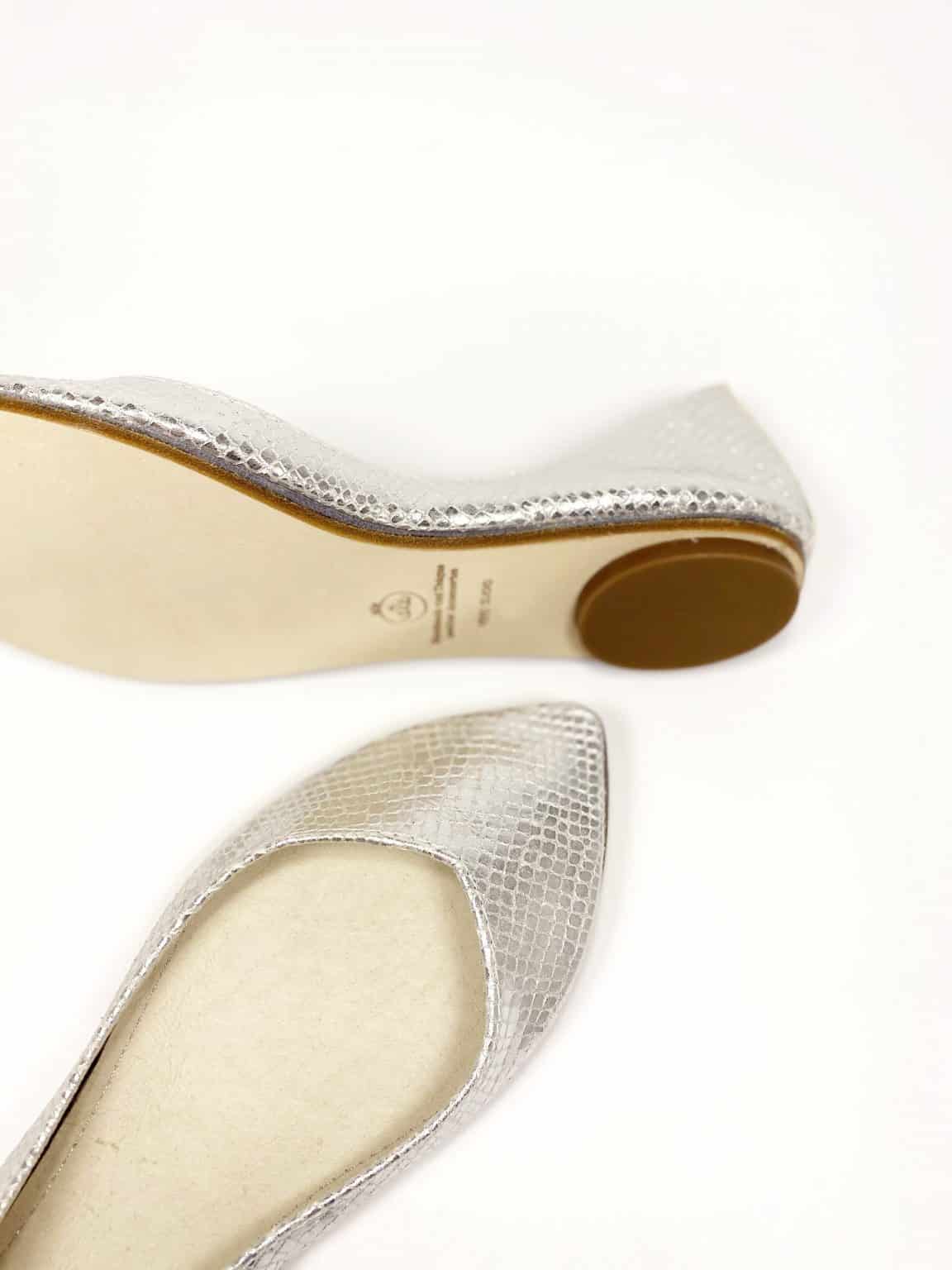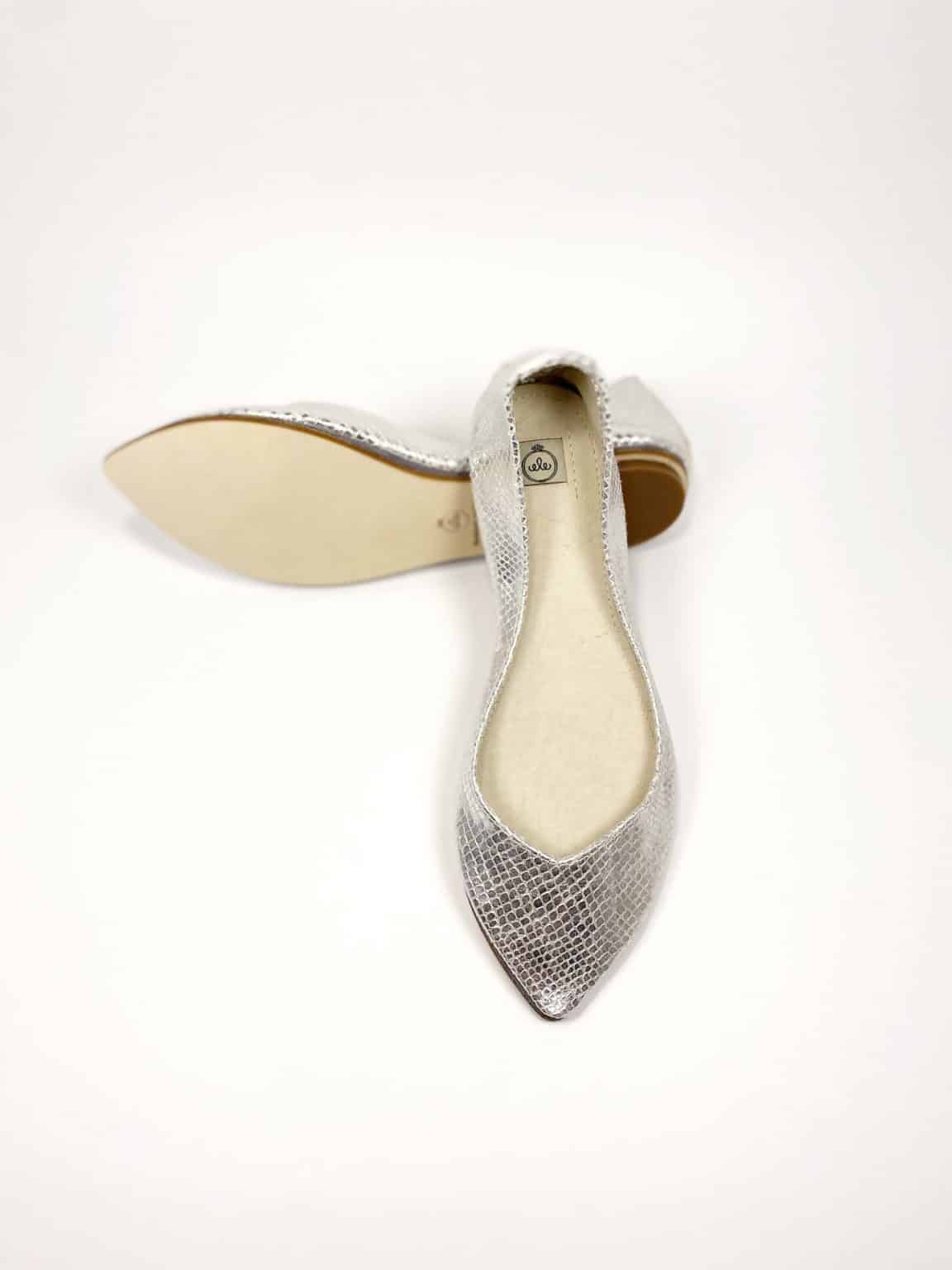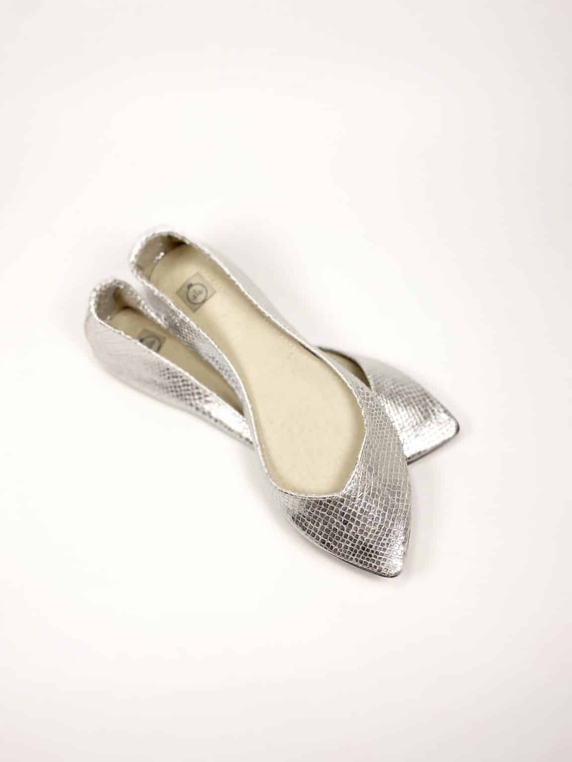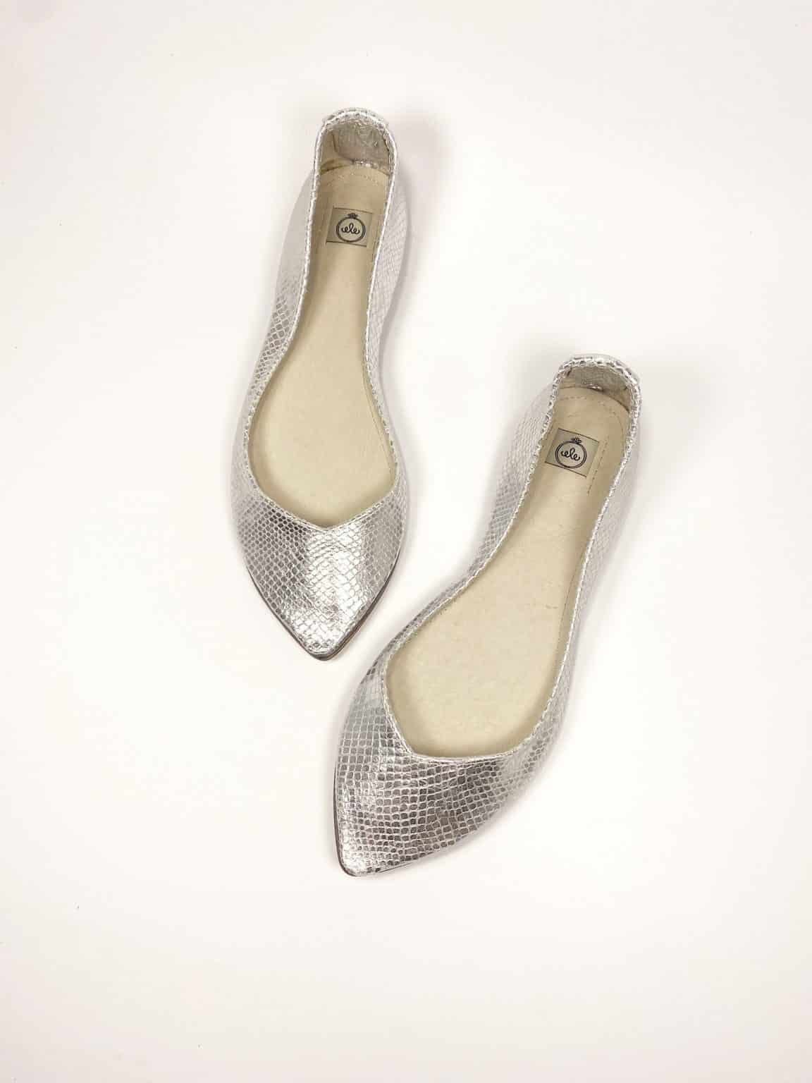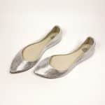 Limited edition ballet flats shoes. Upper in silver snake print Italian leather. Low heel and genuine leather soles.
