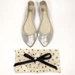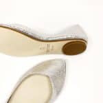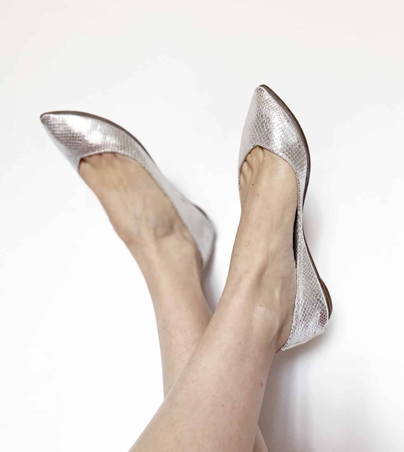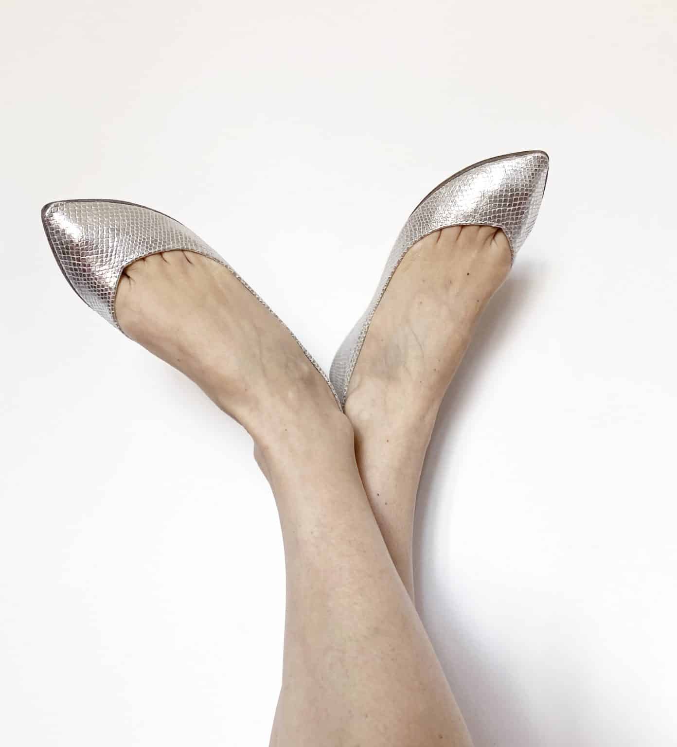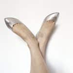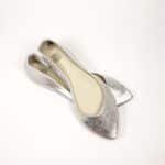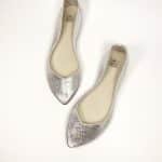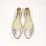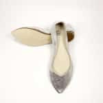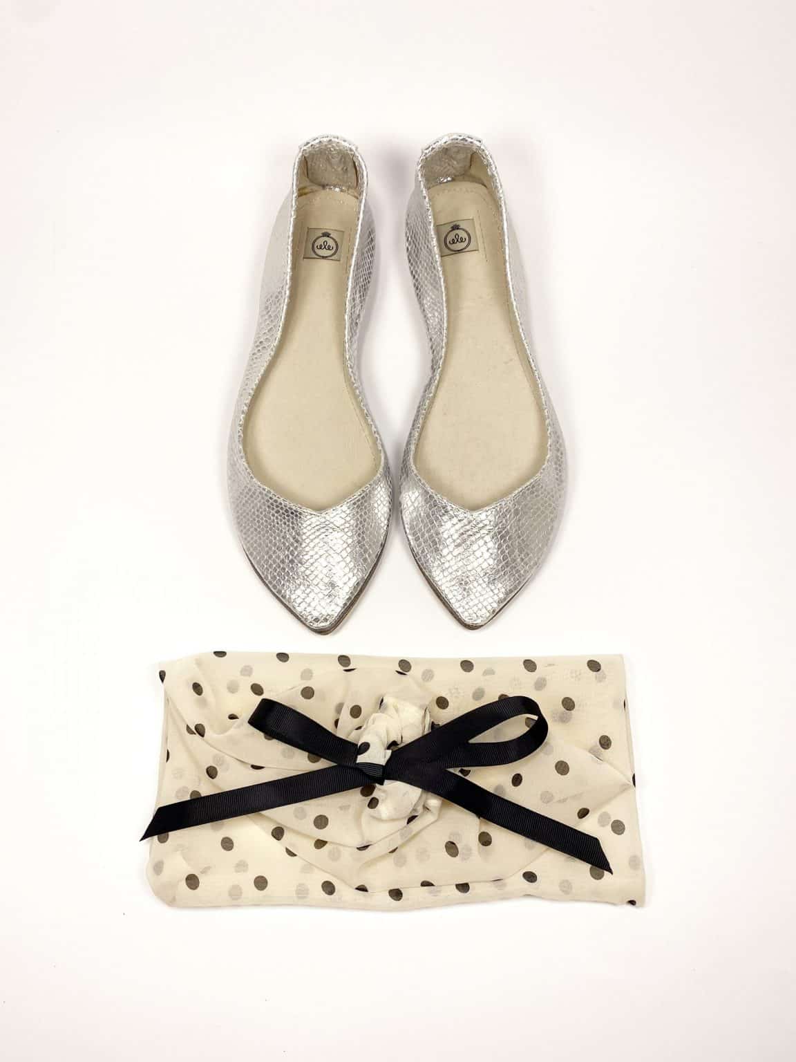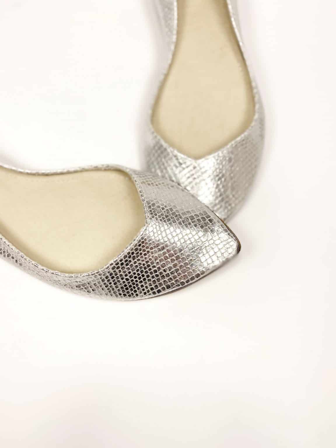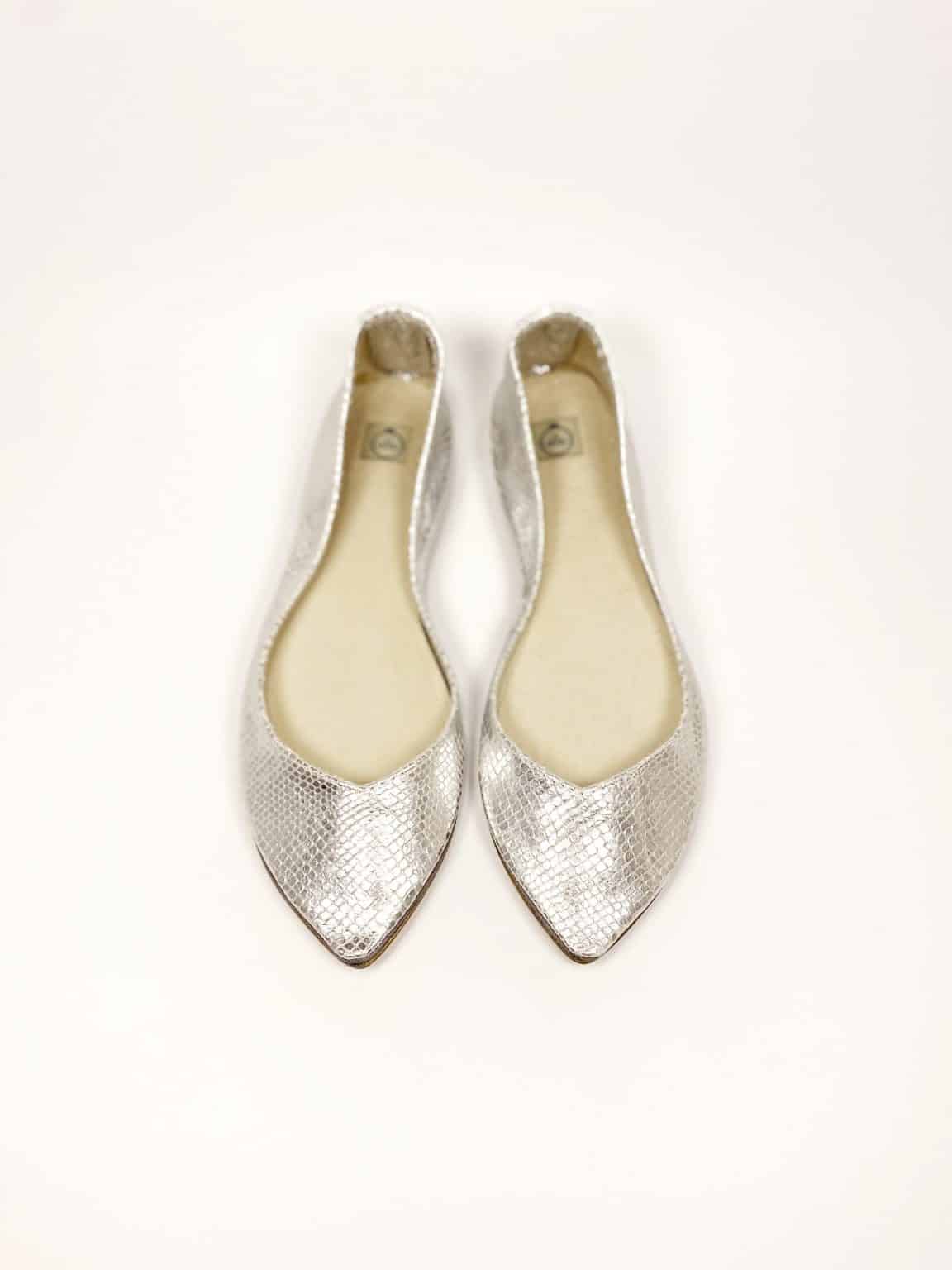 Limited edition ballet flats shoes. Upper in silver snake print Italian leather. Low heel and genuine leather soles.