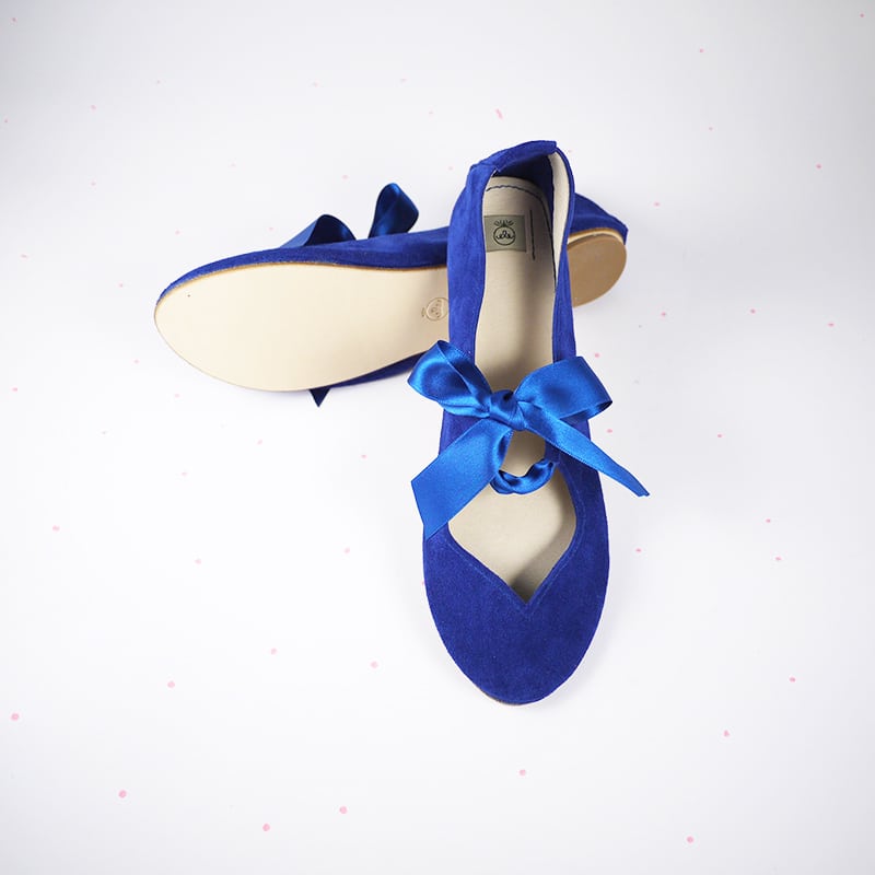 Sweet and sophisticated toe Mary Jane flats. Upper in Royal blue Italian suede leather. Low heel and leather soles.