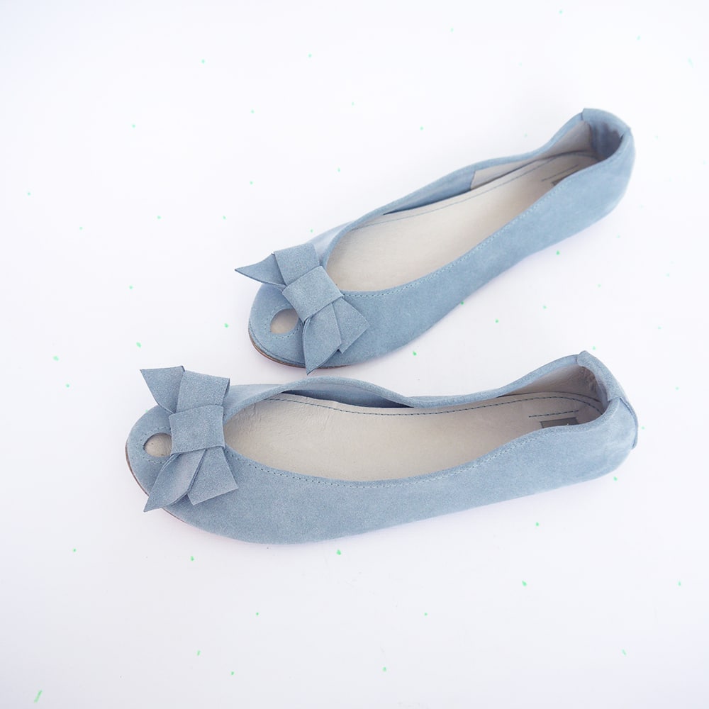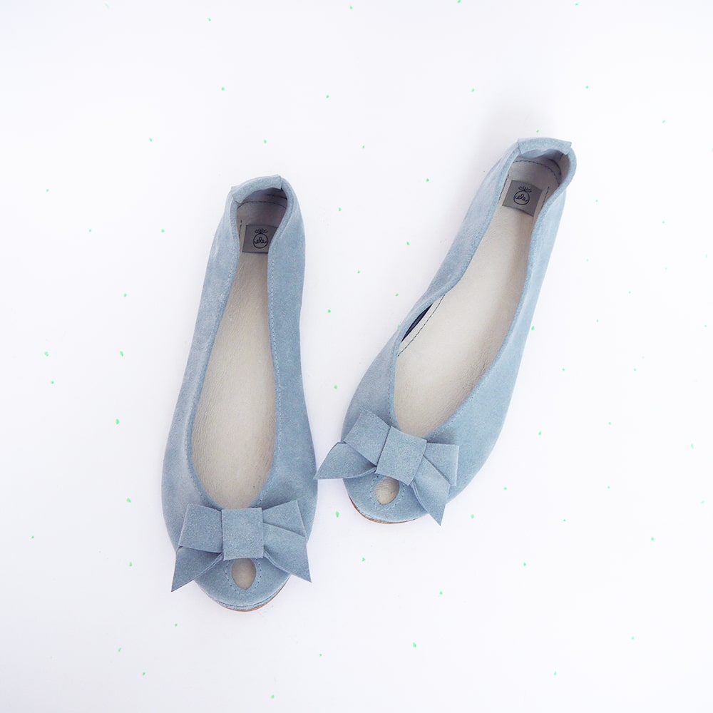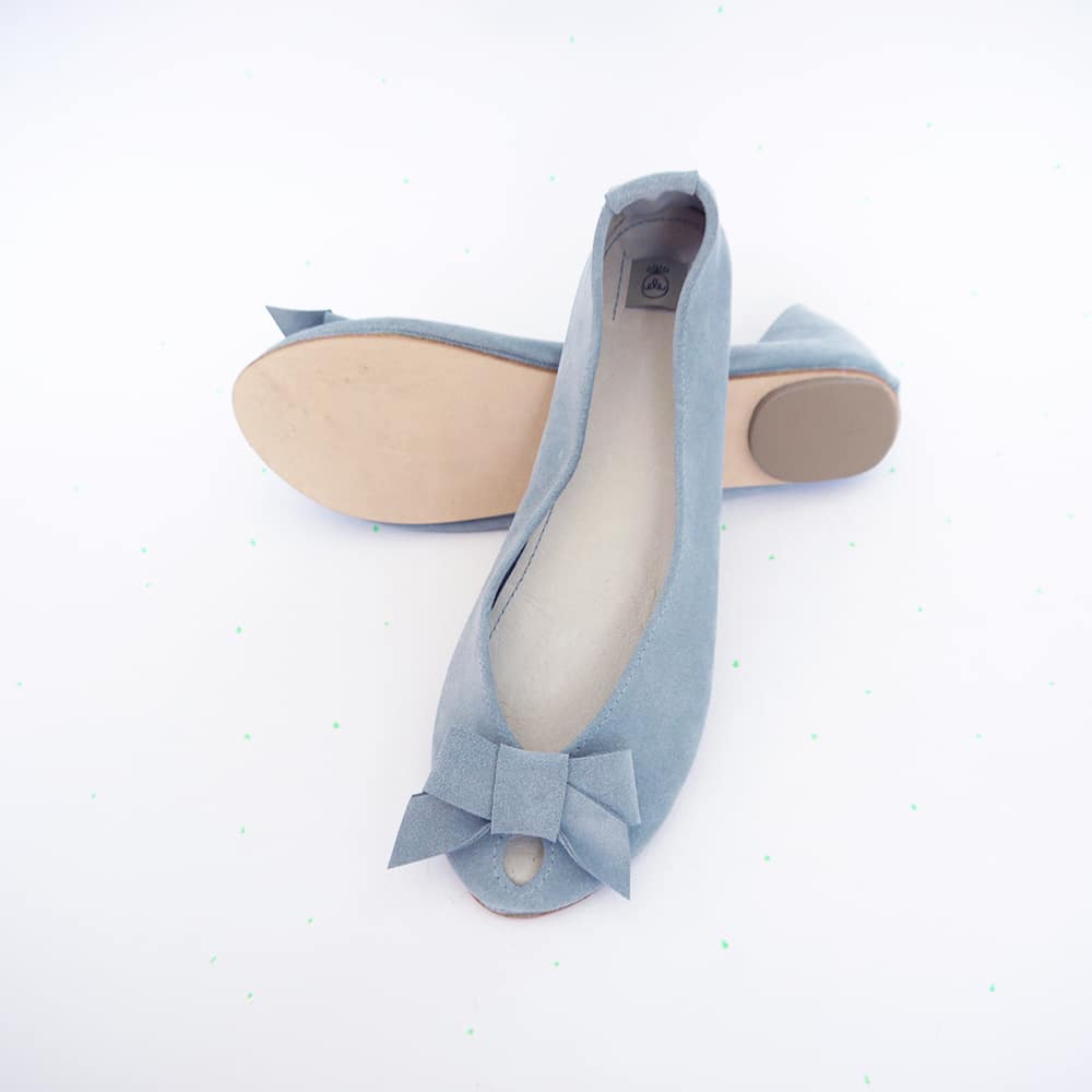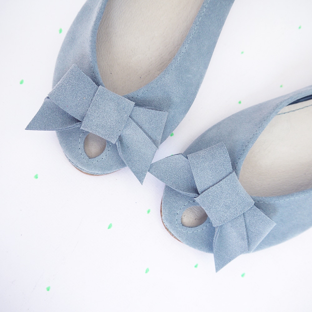 Timelessly chic and super comfortable open toe Flats. Upper in Serenity blue soft Italian suede leather. Low heel and leather soles.