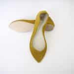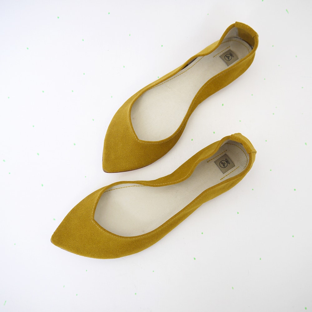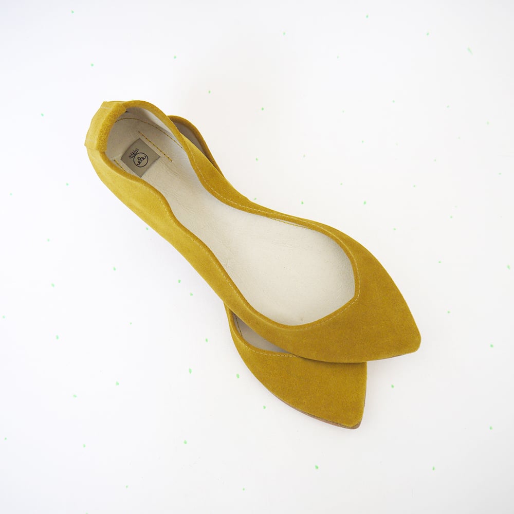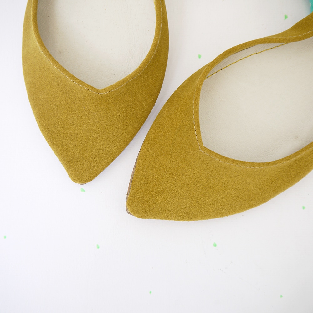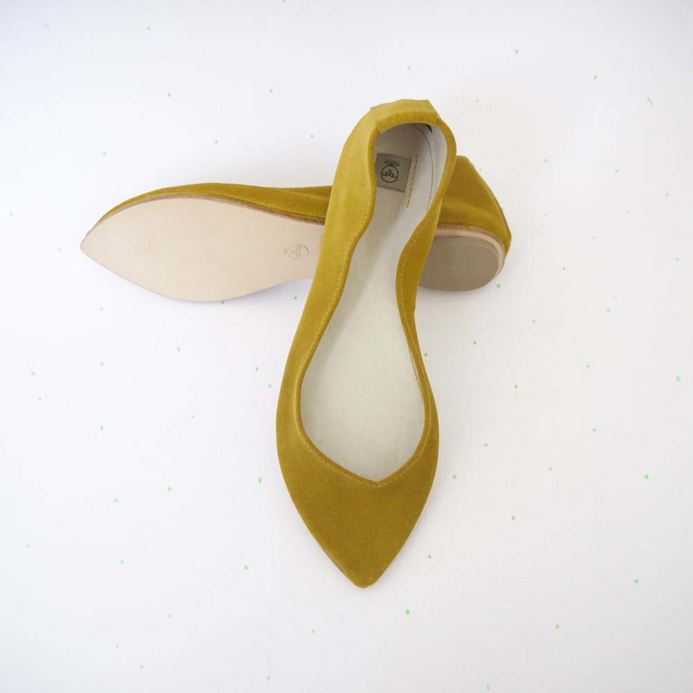 Chic and super comfortable pointed toe flats. Upper in buttery yellow Italian suede leather. Low heel and leather soles.
