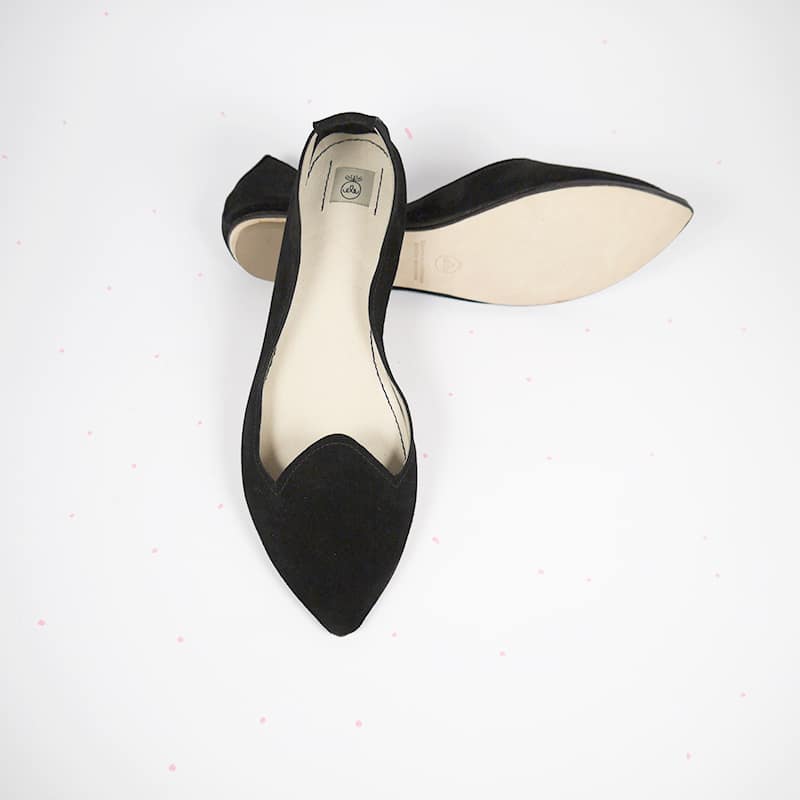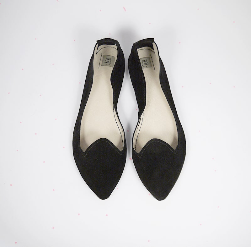 Chic and super comfortable pointed toe loafers. Upper in buttery black Italian suede leather. Low heel and leather soles.