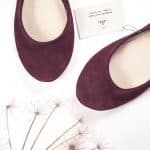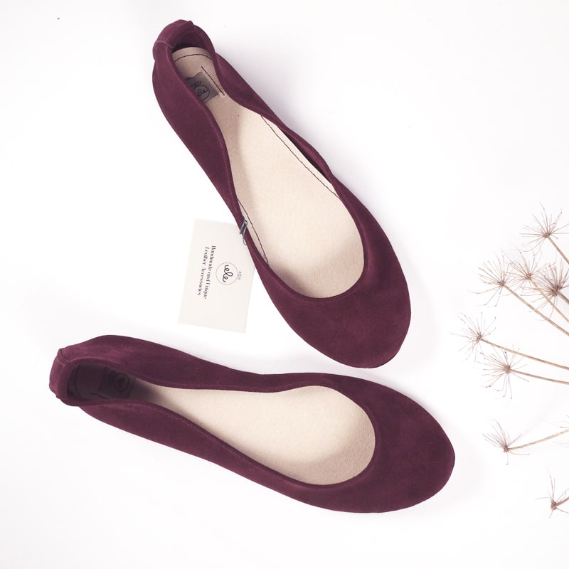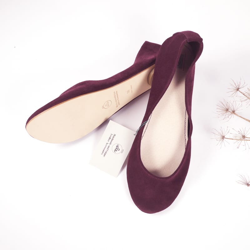Simple yet sophisticated almond toe ballet flats. Upper in burgundy soft Italian suede leather. Genuine leather soles and low heel.