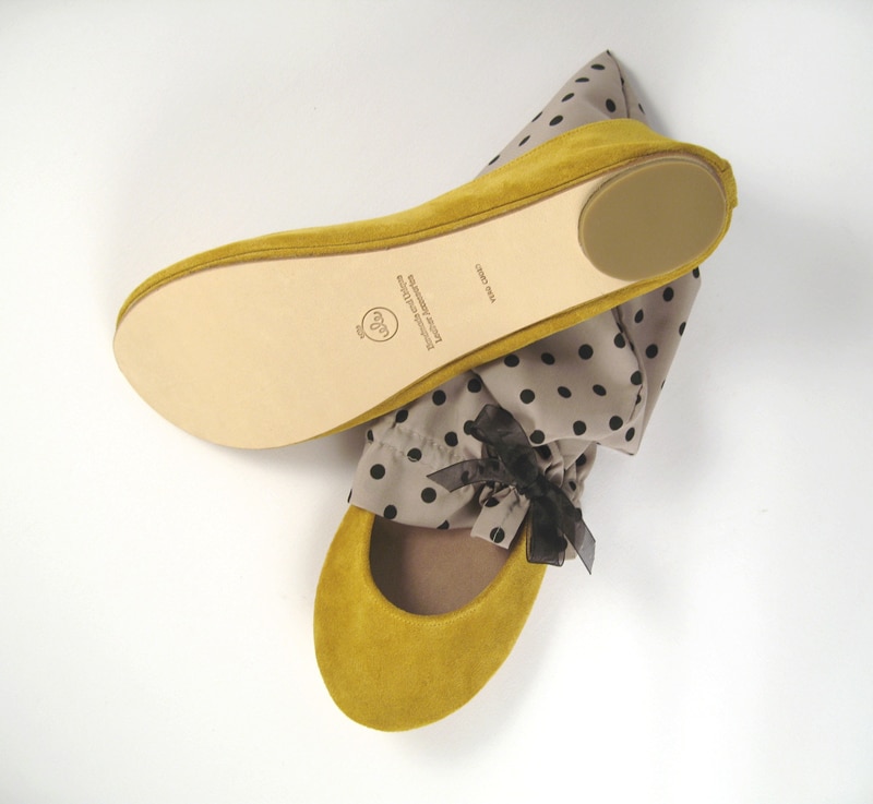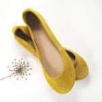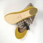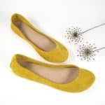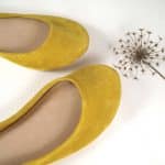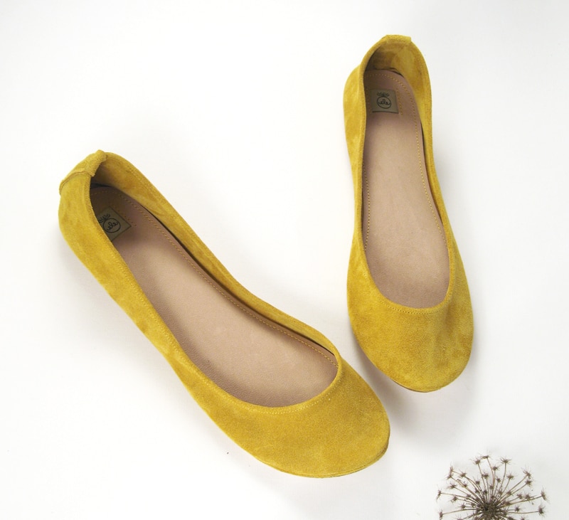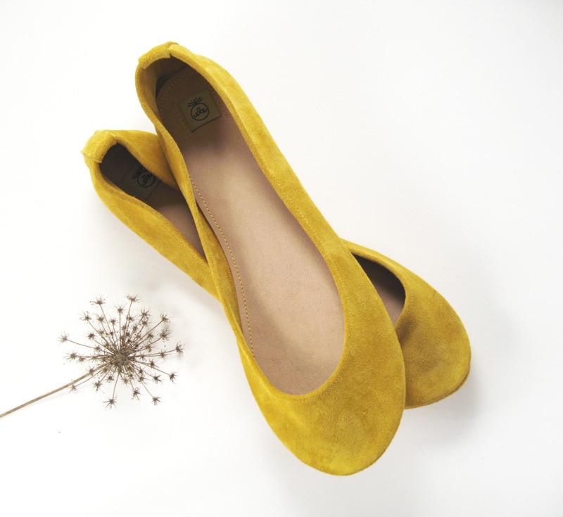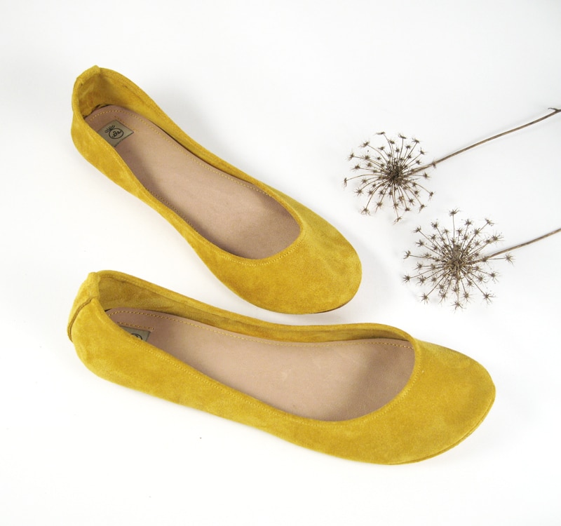 Simple yet sophisticated almond toe ballet flats. Upper in mustard yellow soft Italian suede leather. Genuine leather soles and low heel.