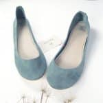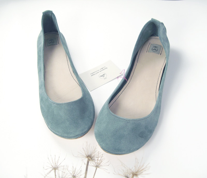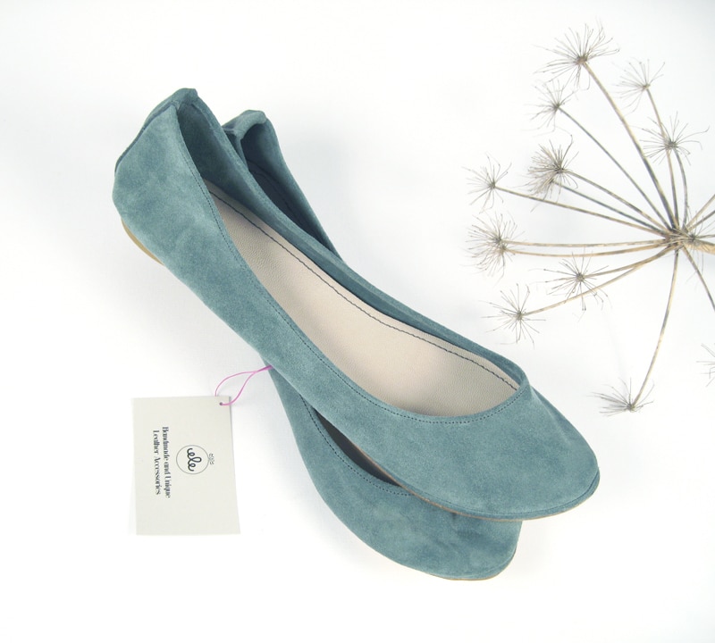 Simple yet sophisticated almond toe ballet flats. Upper in serenity blue soft Italian suede leather. Genuine leather soles and low heel.