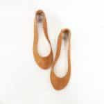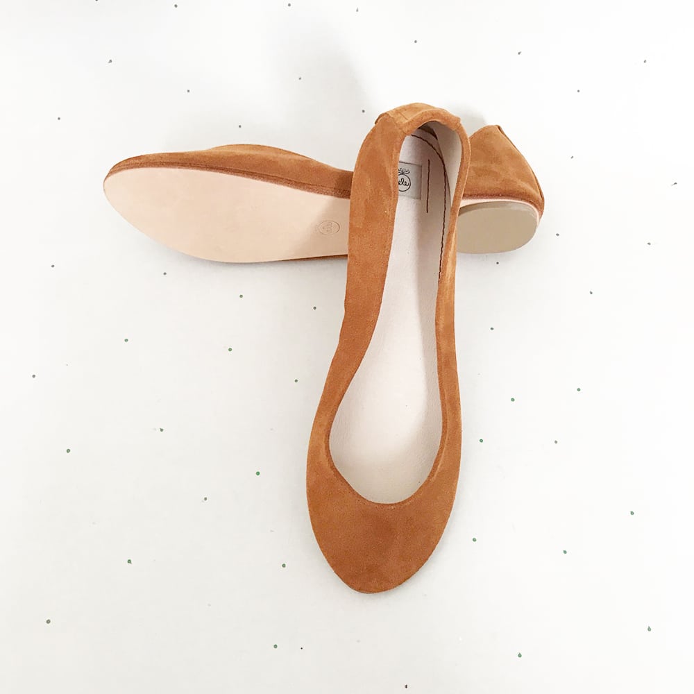 Simple yet sophisticated almond toe ballet flats. Upper in tan soft Italian suede leather. Genuine leather soles and low heel.
