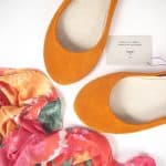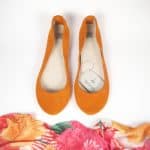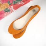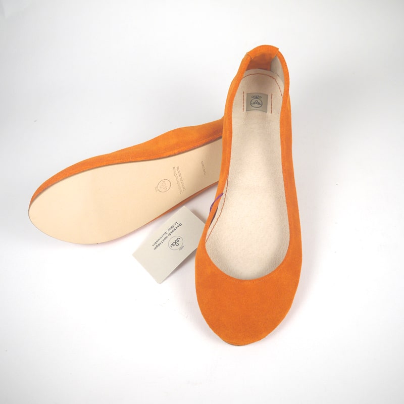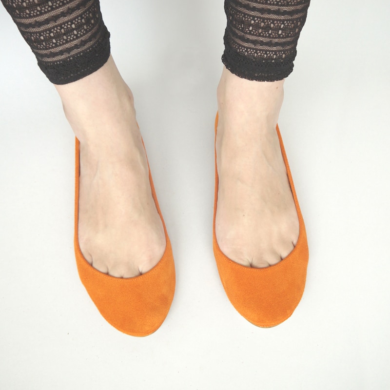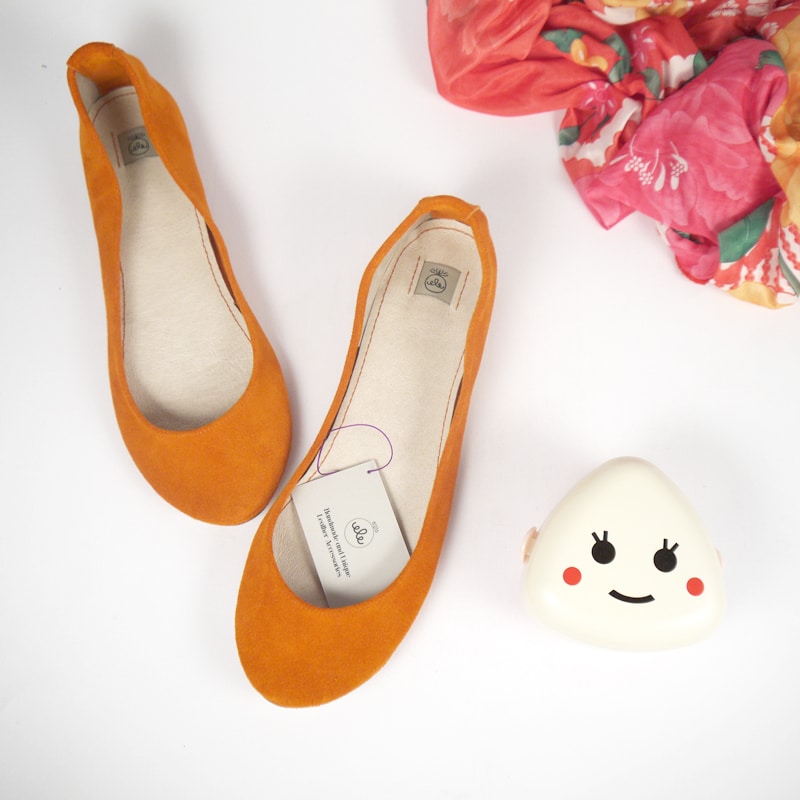 Simple yet sophisticated almond toe ballet flats. Upper in tangerine soft Italian suede leather. Genuine leather soles and low heel.