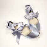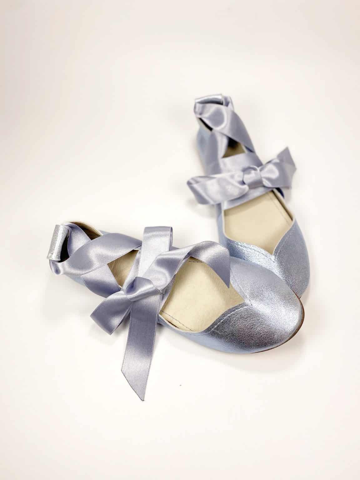 ROUND FLATS IN METALLIC LIGHT BLUE LEATHER with SATIN RIBBONS