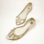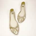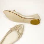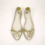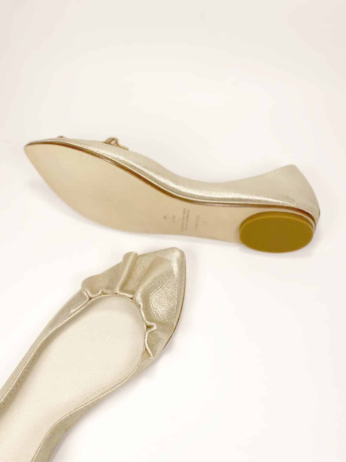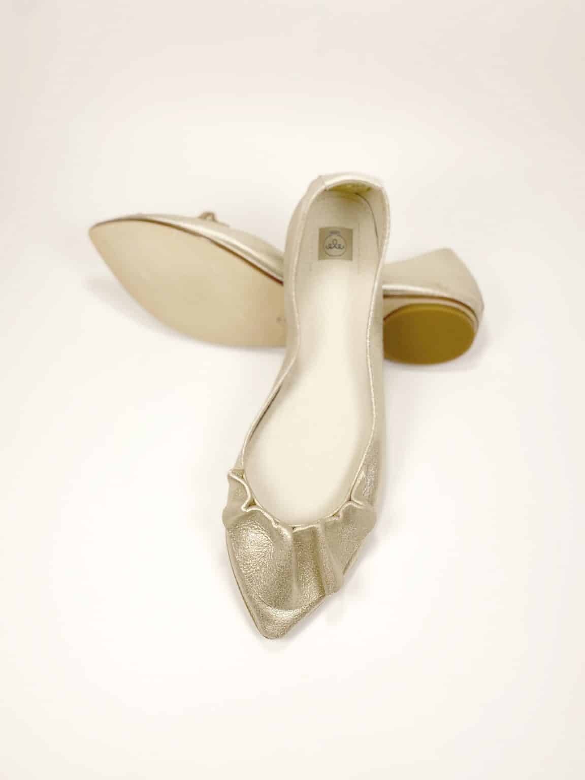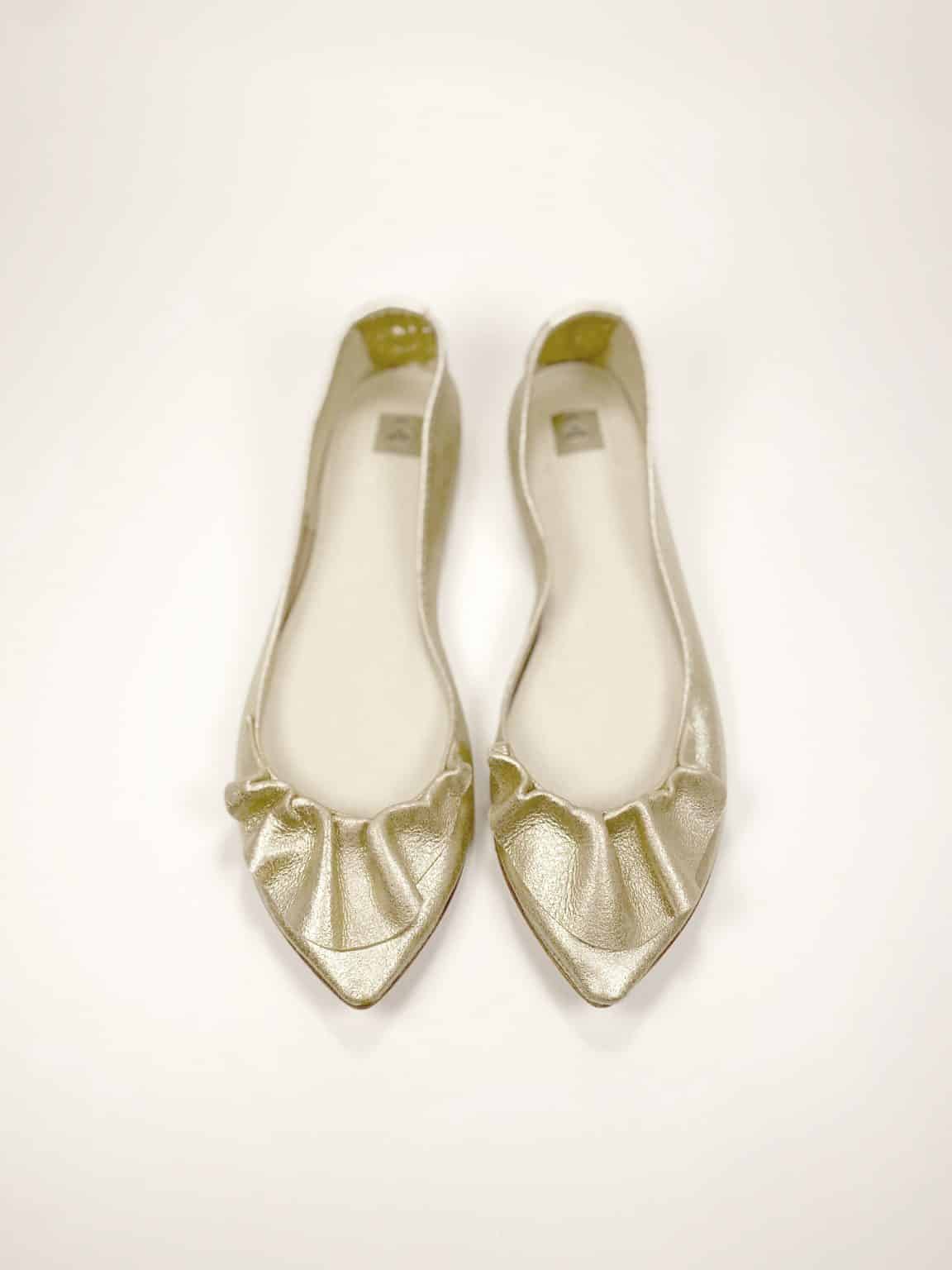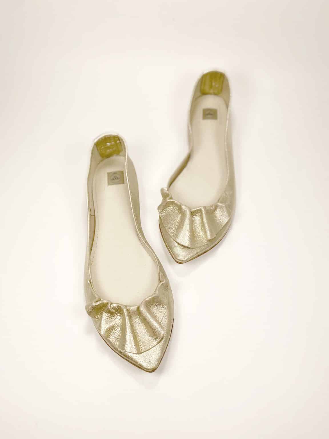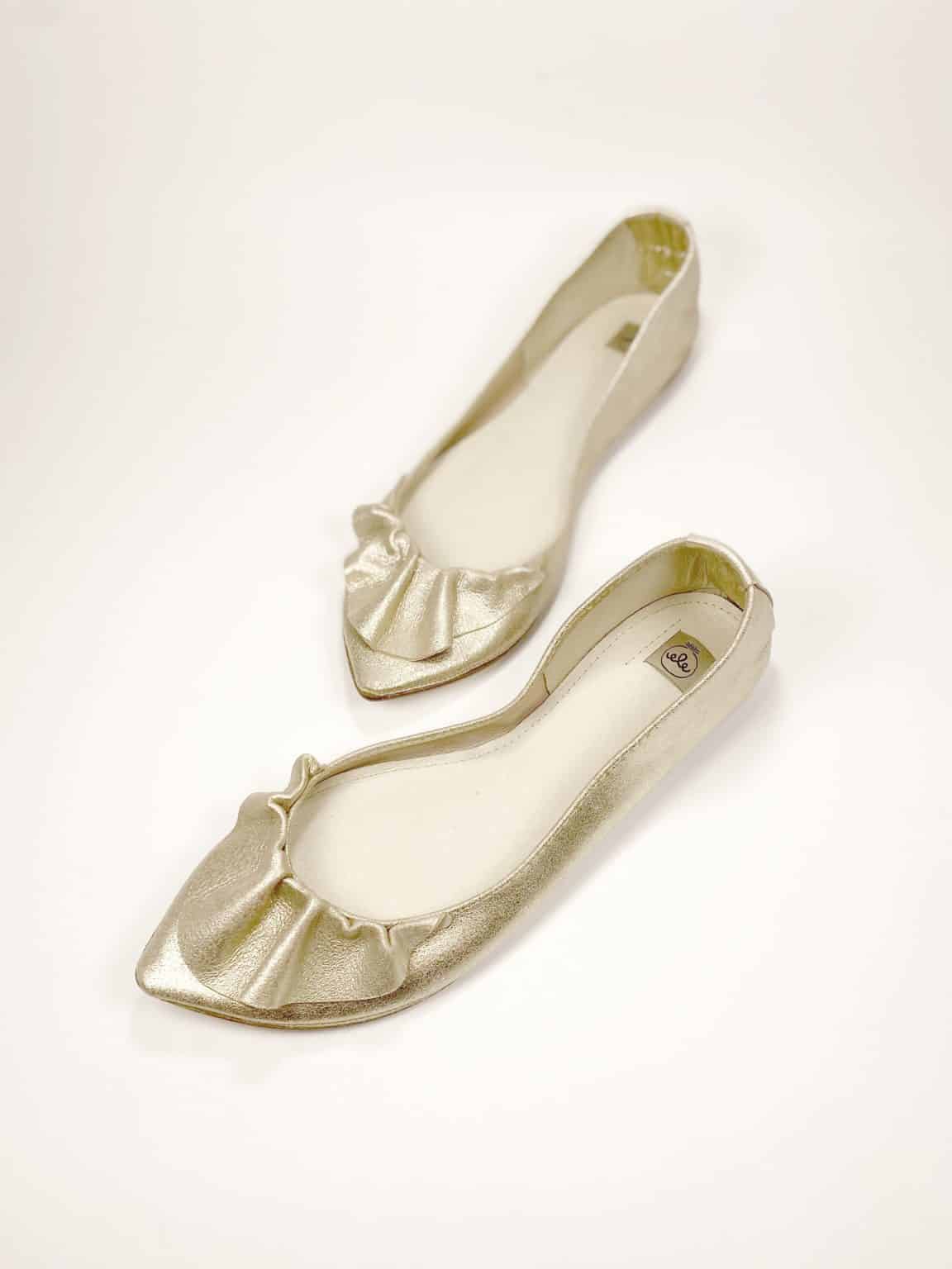 Chic and unique pointed ruffle flats. Gold soft leather upper. Low heel and leather soles.