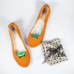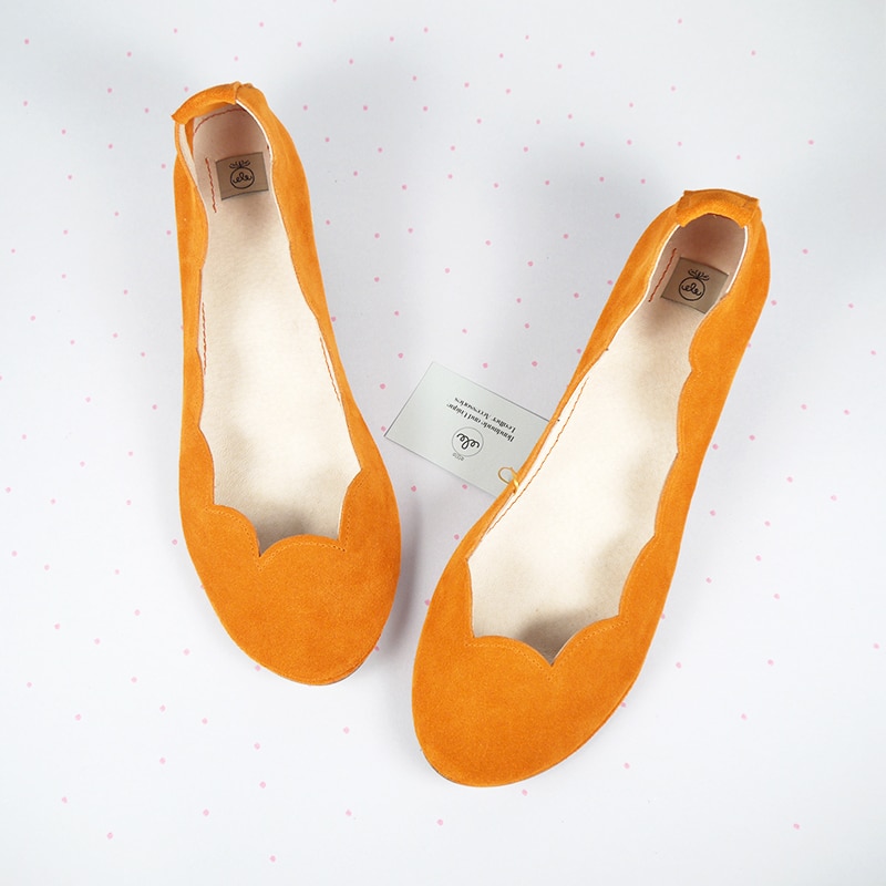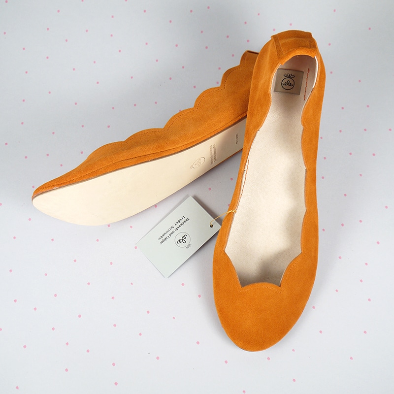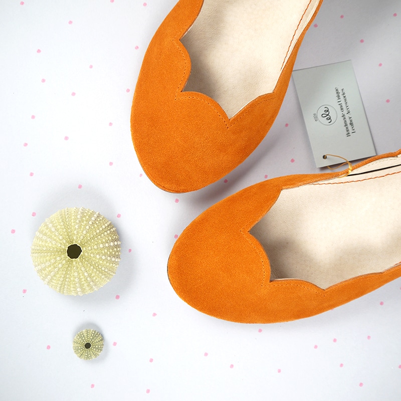 Cute scalloped almond toe ballet flats. Upper in tangerine soft Italian suede leather. Genuine leather soles and low heel.