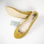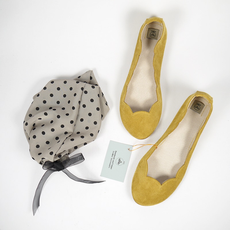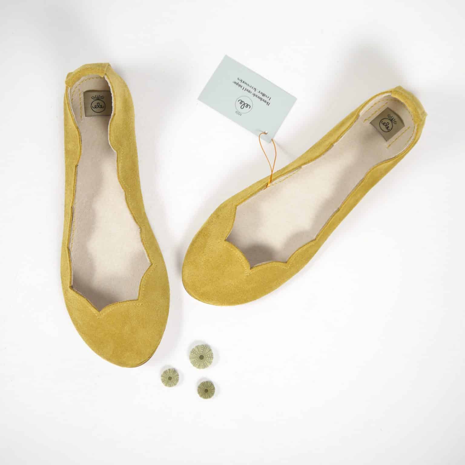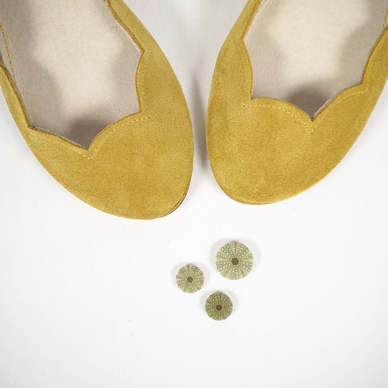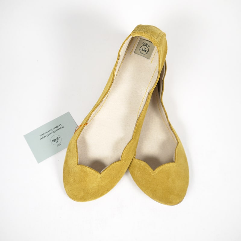 Cute scalloped almond toe ballet flats. Upper in yellow soft Italian suede leather. Genuine leather soles and low heel.