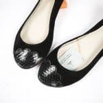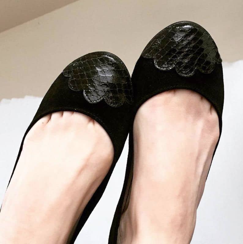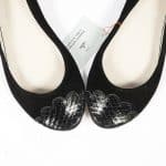 Timelessly chic and super comfortable scalloped toe flats. Upper in black soft Italian suede leather and glossy snake. Low heel and leather soles.